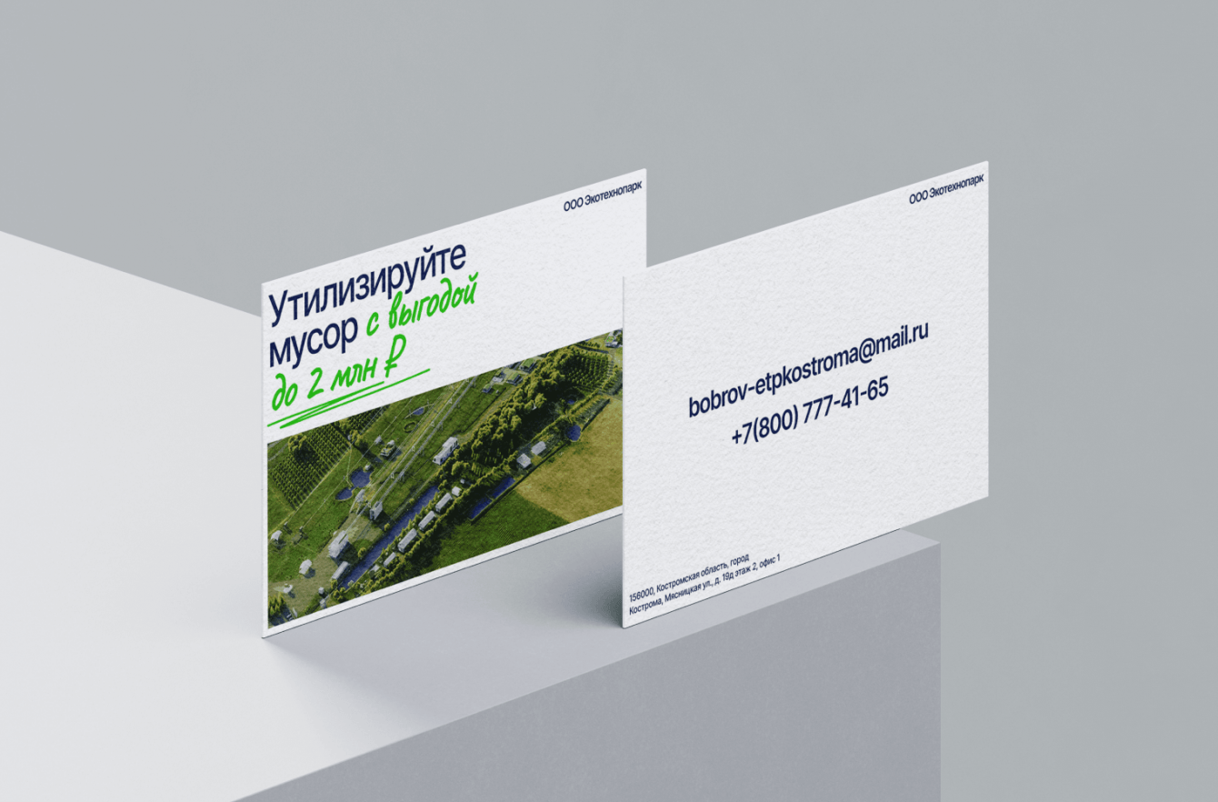 Так как компания «Экотехнопарк» еще не успела обзавестись фирменным стилем, мы сформировали некоторые визуальные правила для коммуникации компании с клиентами помимо сайта. В правила вошли рекомендации по работе с цветами, шрифтами, иллюстрациями и выравниванием элементов на различных форматах макетов.