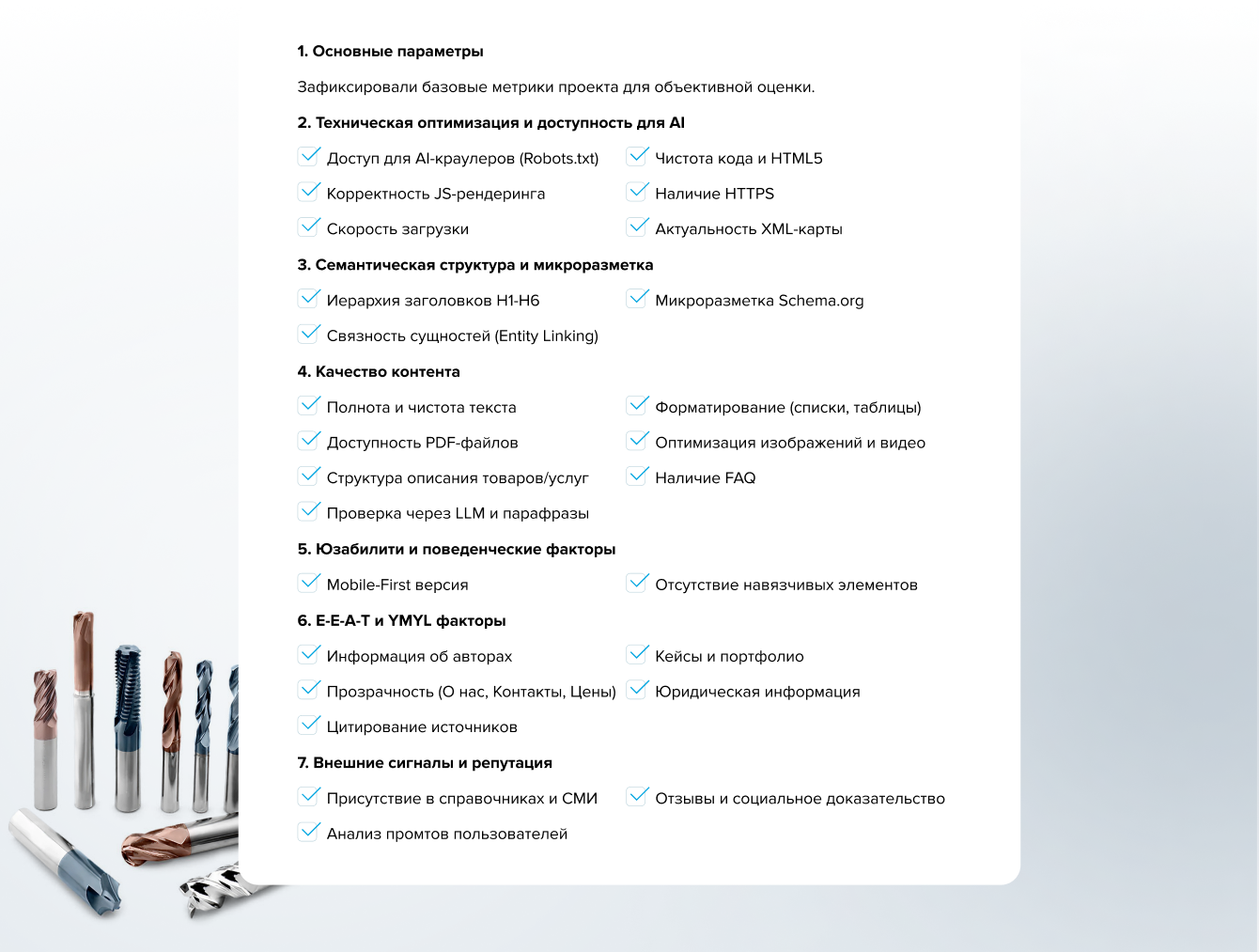 Чек-лист помог сформировать полную картину состояния сайта и определить точки роста для оптимизации под нейровыдачу.