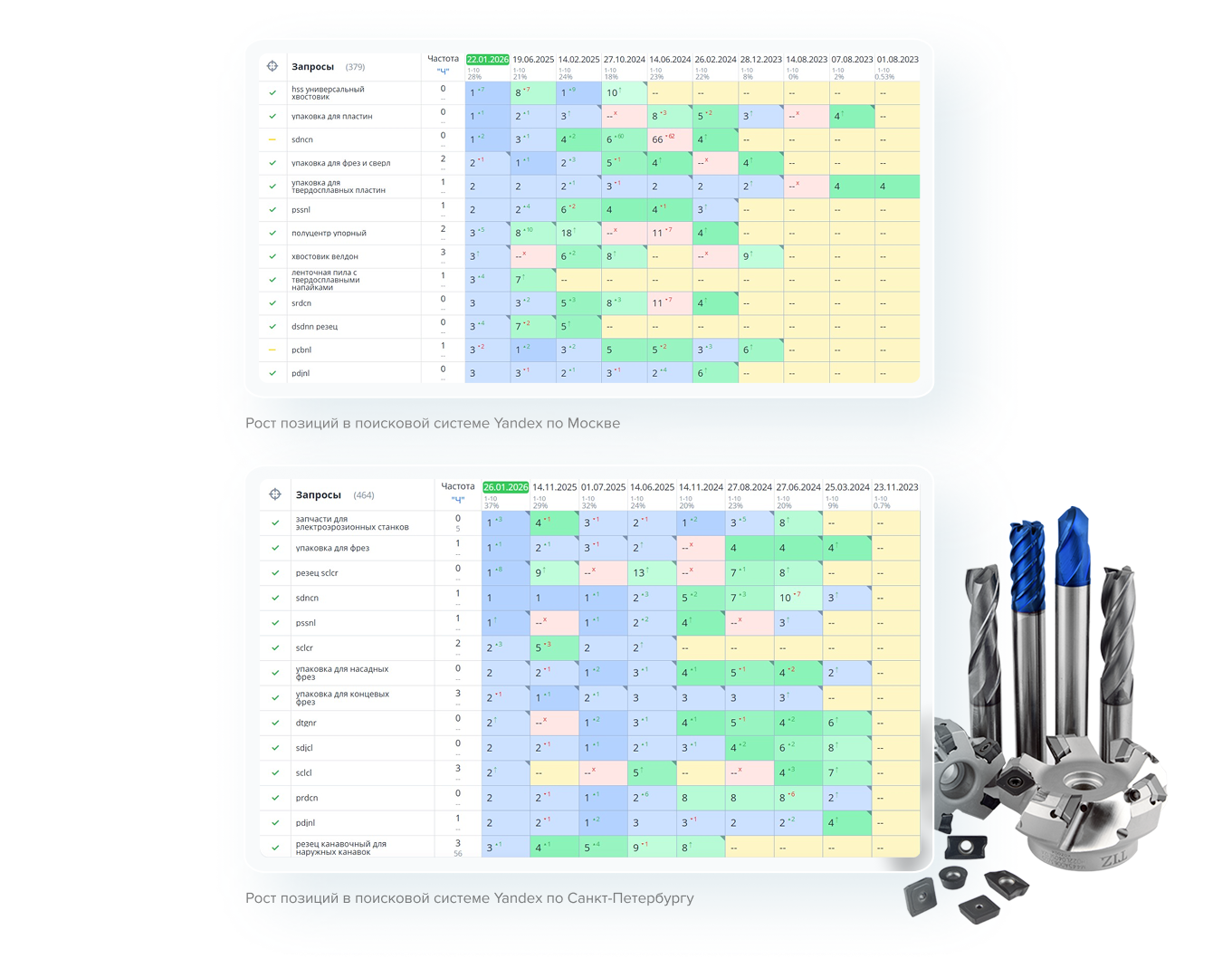 Главной сложностью было составить качественные SEO оптимизированные тексты, которые бы отвечали требованиям экспертности. Для решения этой проблемы текст проверялся минимум 3-мя специалистами по металлорежущим инструментам и одним SEO специалистом по чек листу: