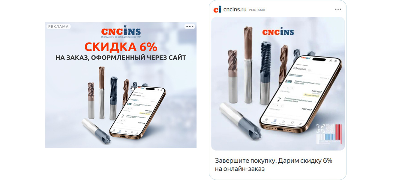 Для аудитории, которая была на сайте, но не совершила заказ, мы сделали объявления с акцентом на скидку на онлайн-заказ.