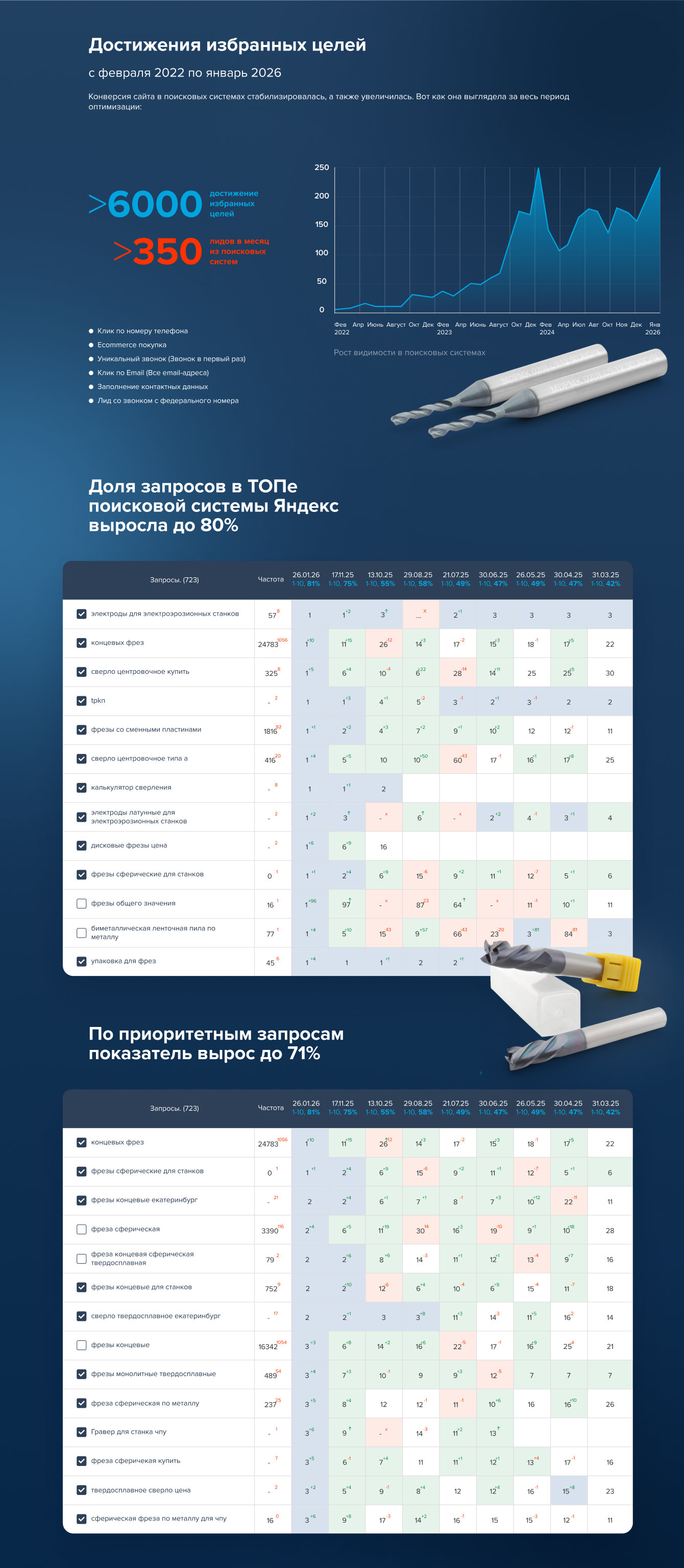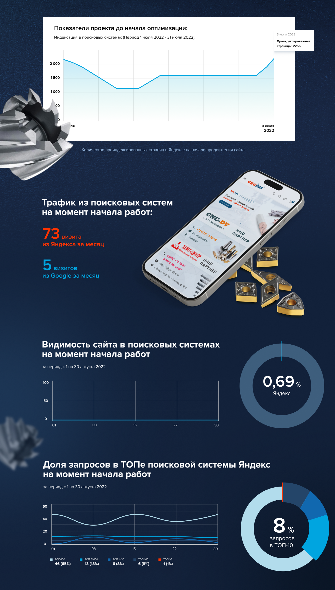 Этот кейс подробно раскрывает комплексную стратегию и методы, которые позволили достичь значительных результатов, а также демонстрирует успехи сайта в нише металлорежущих инструментов. В нем гармонично сочетаются работы по SEO-оптимизации и контекстной рекламе, которые взаимно дополняют и поддерживают друг друга на протяжении всего проекта.