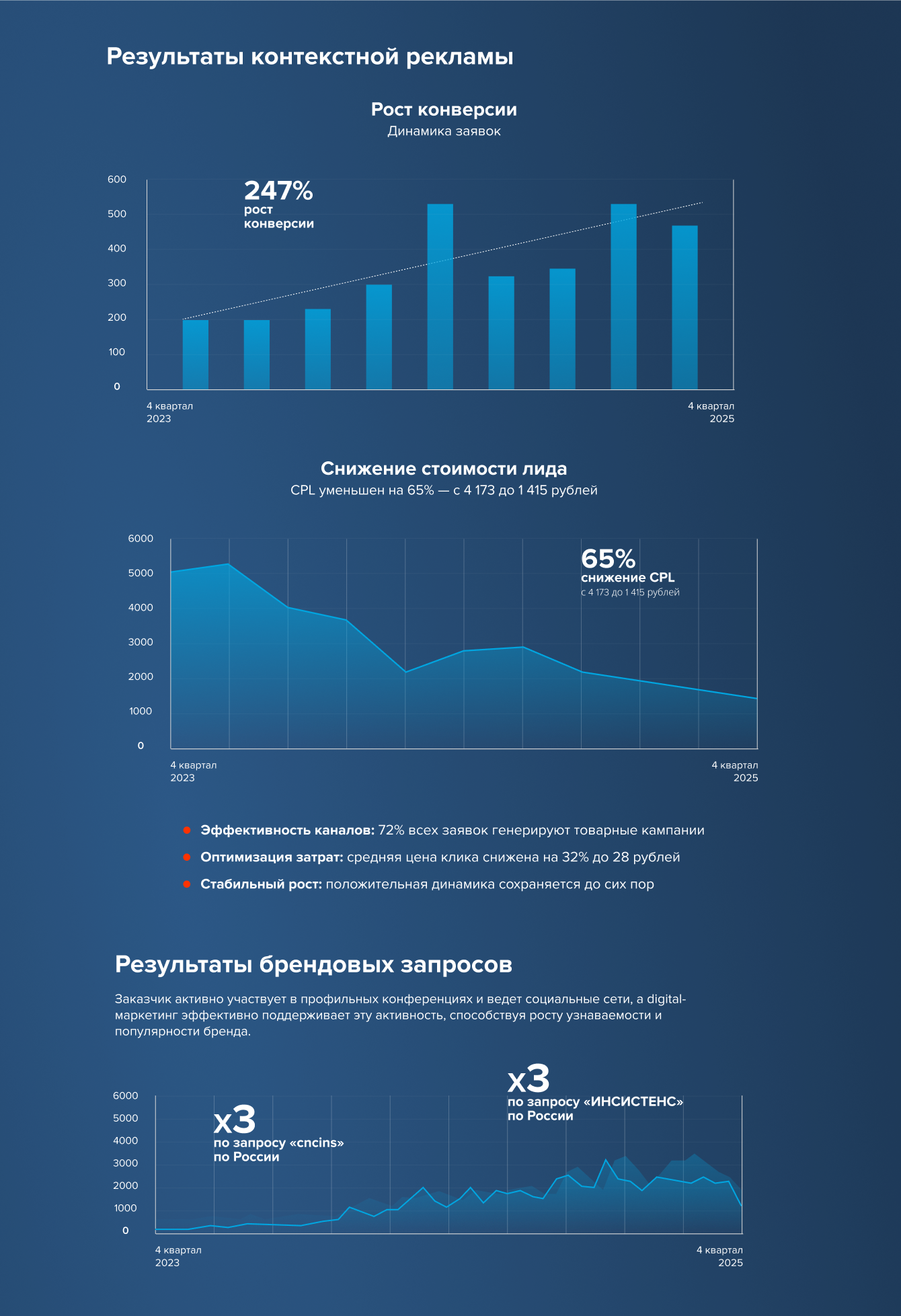 Рекламного трафика у заказчика не было, поэтому кампании были настроены полностью с нуля и проходили постоянную оптимизацию в течение нескольких лет для достижения максимальной эффективности.