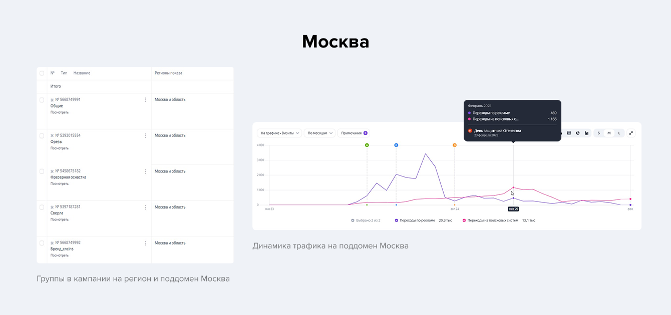 В 2025 году мы заметили, что органический трафик на поддомен Москвы превысил рекламный, поскольку последний напрямую зависит от бюджета. С помощью сквозной аналитики мы также выявили, что заявки из Москвы в основном поступают с основного сайта. В связи с этим было принято решение отказаться от рекламной кампании на Москву и перераспределить выделенные средства в пользу более конверсионных направлений, что позволило повысить эффективность бюджета и улучшить кол-во лидов.