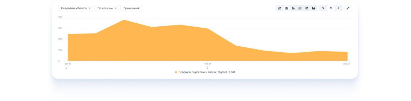 С помощью рекламы нам удалось привлечь дополнительный трафик на сайт в период, когда позиции по SEO только начинали расти. Кроме того, реклама на посадочных страницах калькулятора эффективно поддерживала поток посетителей в моменты снижения органического трафика. Средняя позиция объявления в поисковой выдаче составляла 2 место. Средняя стоимость клика по всем типам площадок составила 23 рубля. Конверсия с рекламных переходов на страницы калькулятора составила 1%.