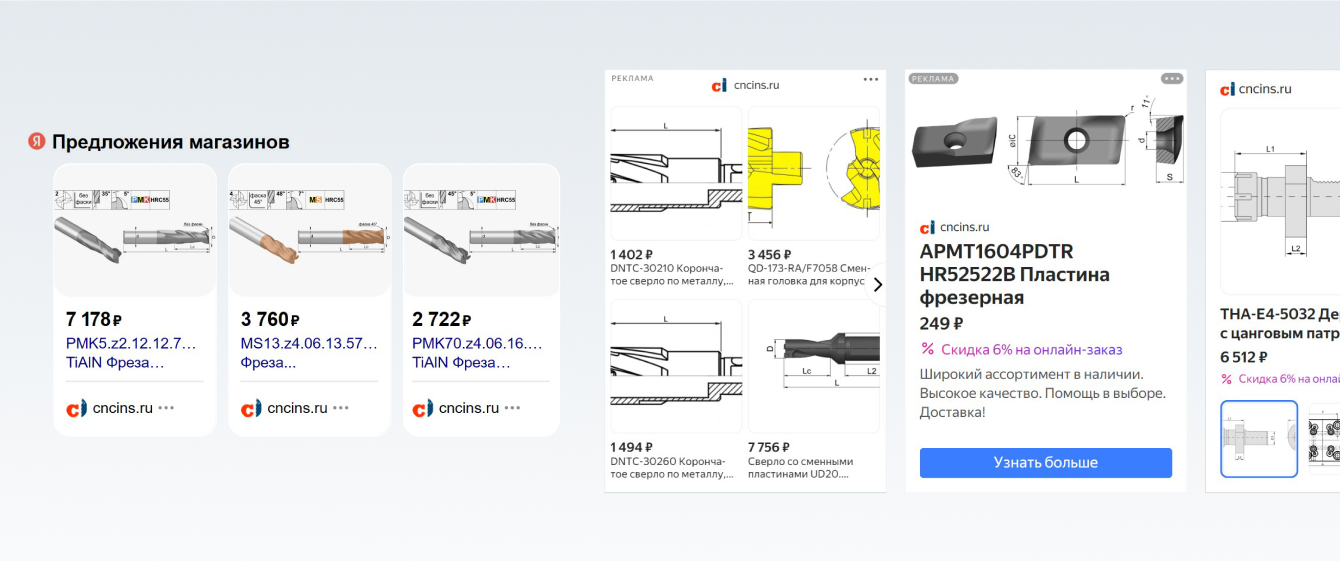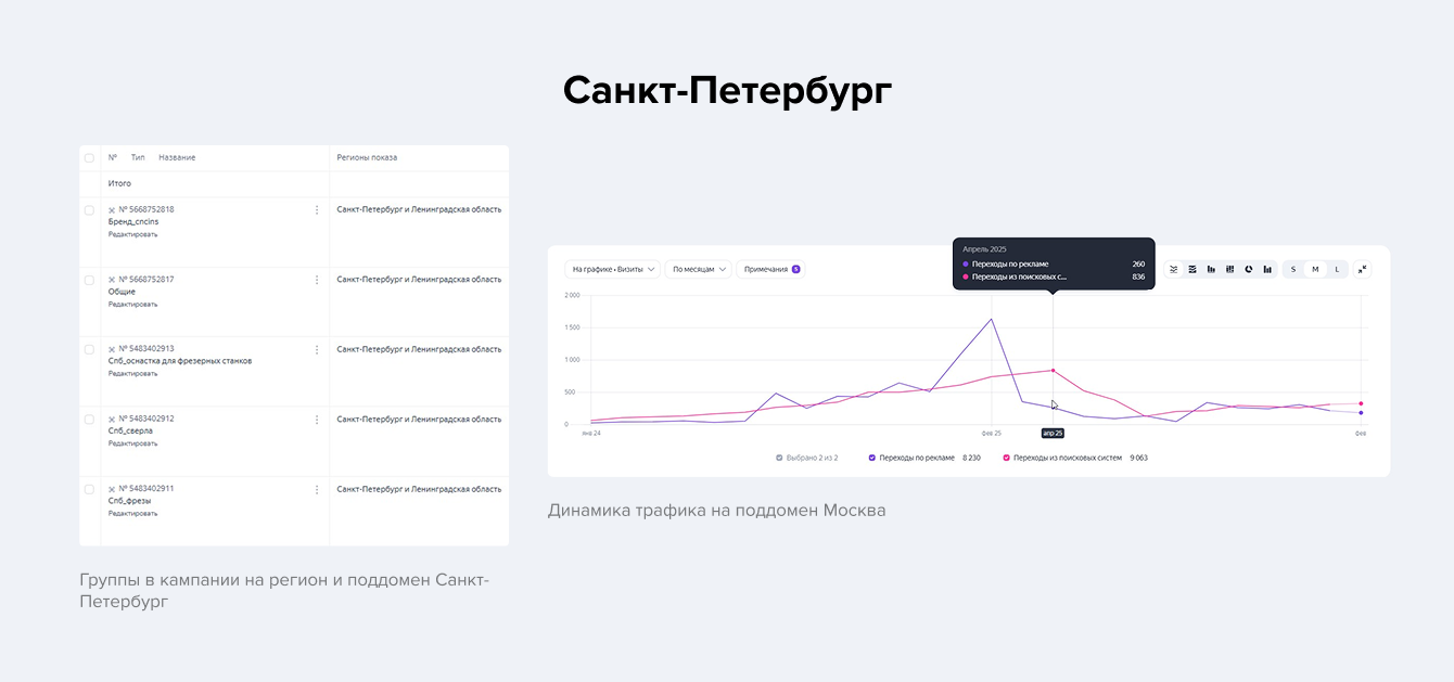 Поскольку домены только были созданы, для ускоренного привлечения трафика была задействована реклама. Мы запустили отдельную поисковую кампанию с выделенным бюджетом специально для продвижения поддомена. В условиях ограниченного бюджета мы сосредоточились на приоритетных направлениях: фрезерная оснастка, твердосплавные фрезы и сверла, а также общие и брендовые запросы. Такой подход позволил максимально эффективно использовать ресурсы и быстро повысить посещаемость сайта.