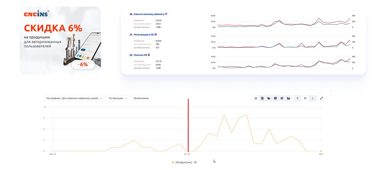 Основная цель контекстной рекламы — увеличить количество онлайн-заказов. Одним из эффективных инструментов стала догоняющая реклама, нацеленная на тех, кто посетил личный кабинет, но не зарегистрировался. Мы создали цели, связанные с использованием личного кабинета, и показывали таким пользователям предложение со скидкой 6% при оформлении заказа через кабинет.