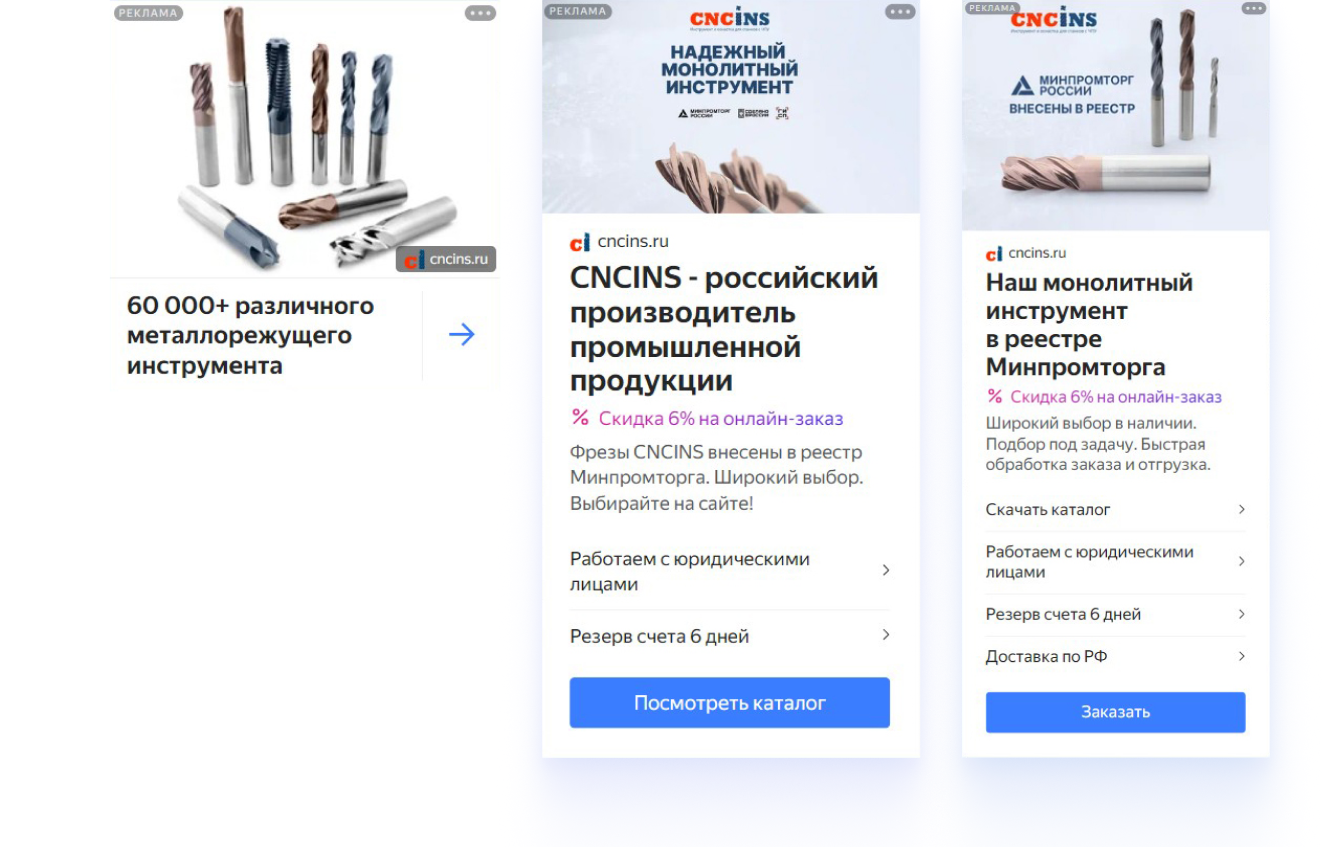 Для аудитории, сформированной на основе CRM и похожих сегментов, мы сделали акцент на широком ассортименте продукции и наличии товаров в реестре Минпромторга.
