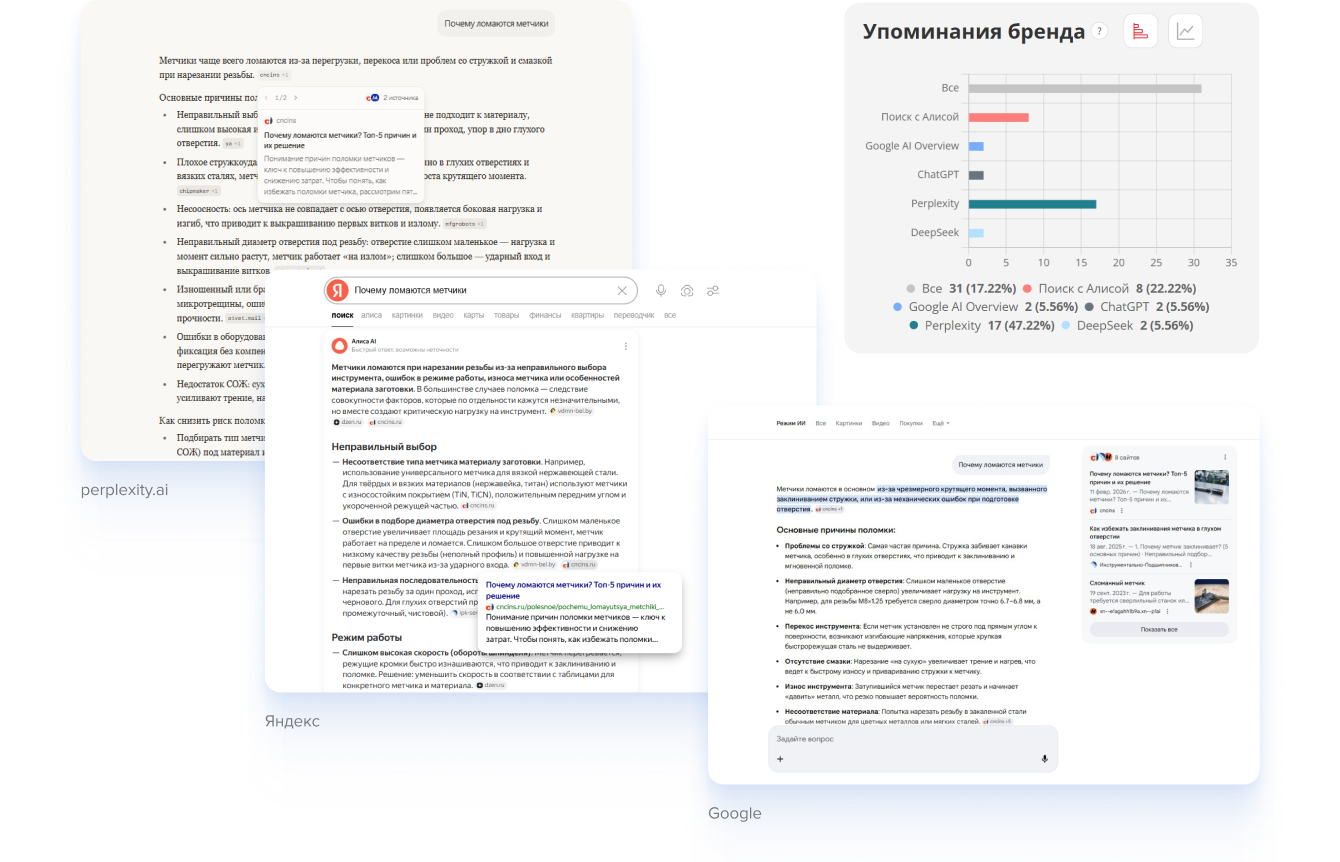 После этого, опираясь на план, составленный по итогам аудита, мы начали прорабатывать сайт под эти промпты — адаптировать контент и структуру для повышения шансов попадания в нейровыдачу.