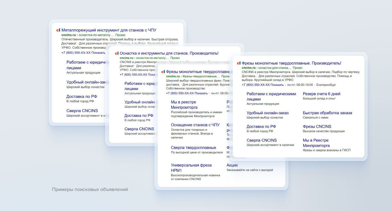 В начале работы были созданы стандартные поисковые кампании и кампании в рекламных сетях. Основной упор делался на такие ключевые преимущества, как наличие товара, высокое качество, быстрая отгрузка и другие факторы, которые максимально привлекали внимание нашей целевой аудитории.
