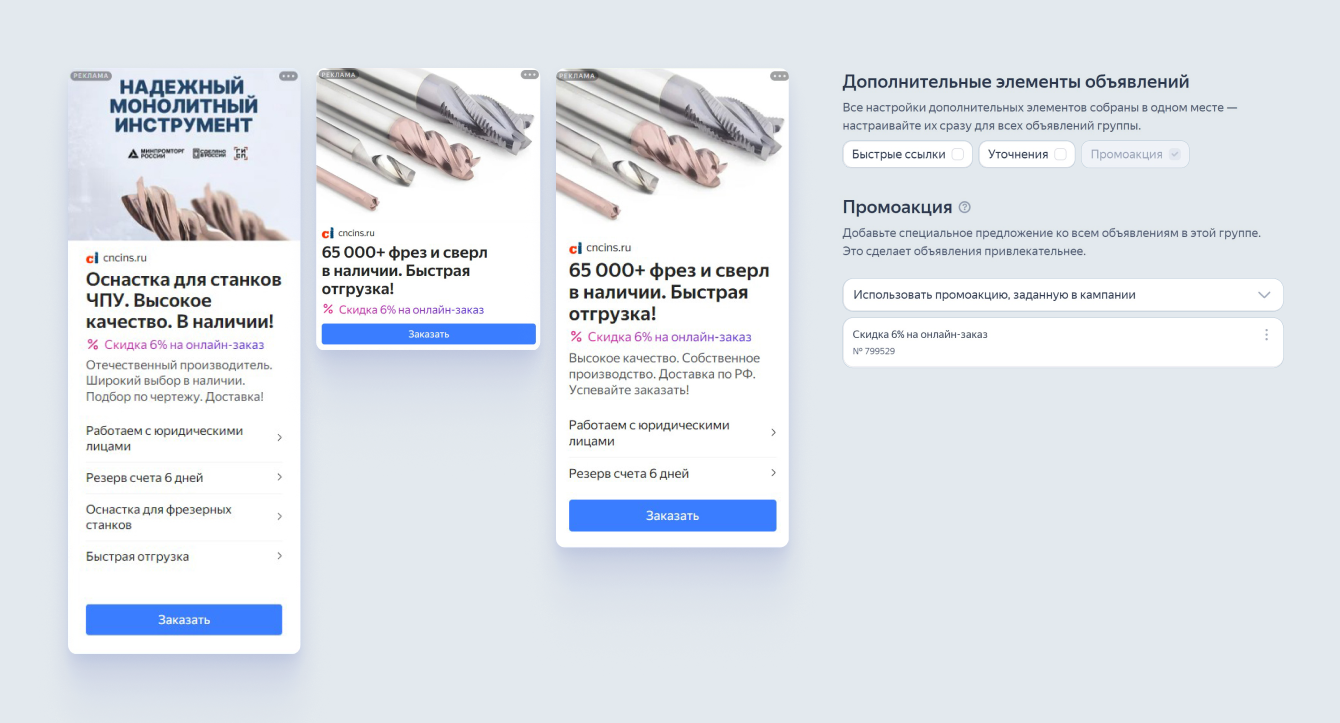 В рекламные кампании была добавлена акция с 6% скидкой для стимулирования онлайн-продаж. В течение всей работы над проектом мы активно использовали дополнительный элемент «Промоакция», поскольку в разные периоды времени запускались различные акции. Это позволило гибко адаптировать рекламные материалы под текущие предложения и повысить заинтересованность аудитории.