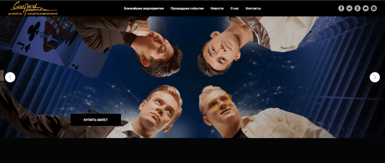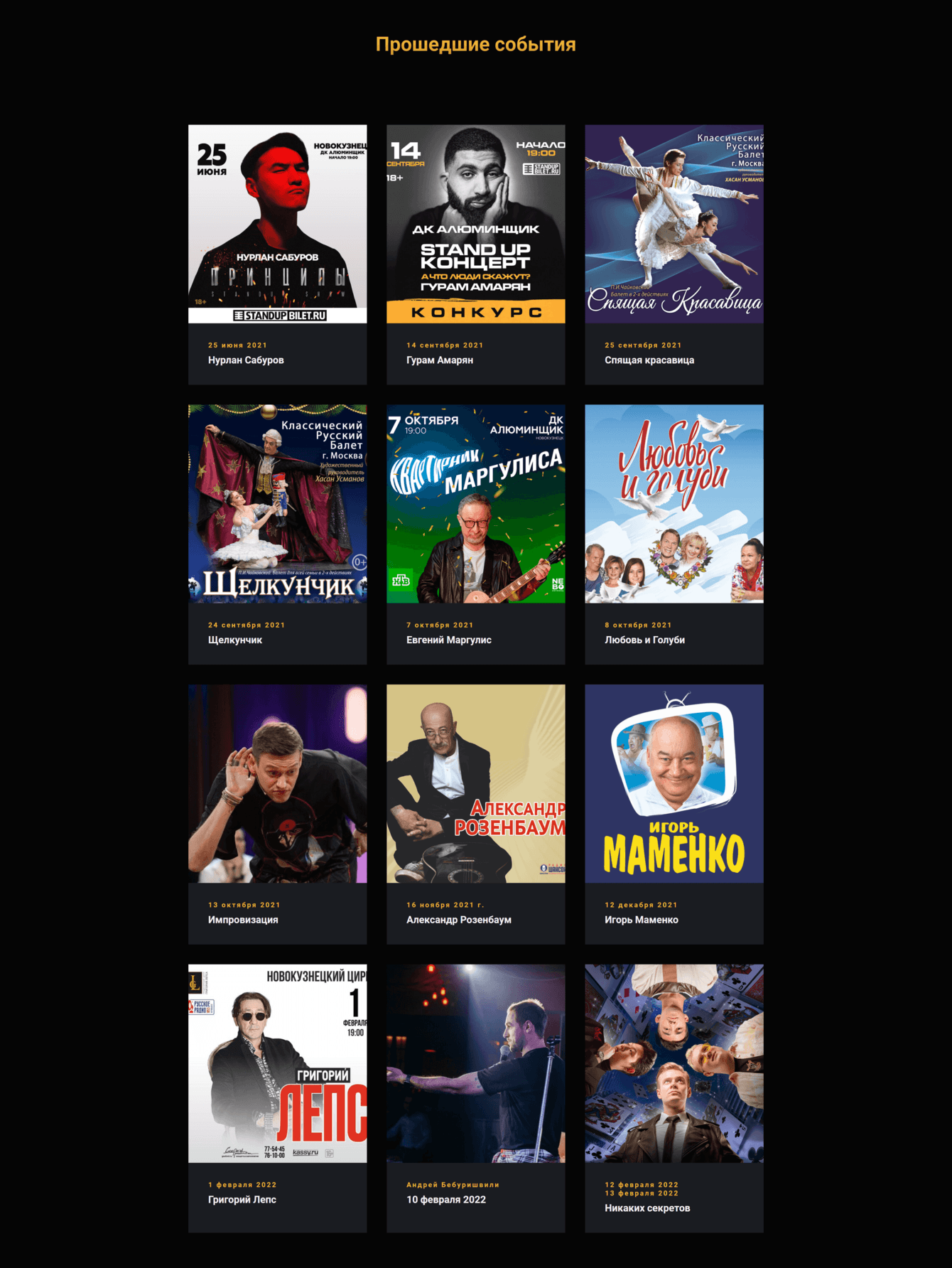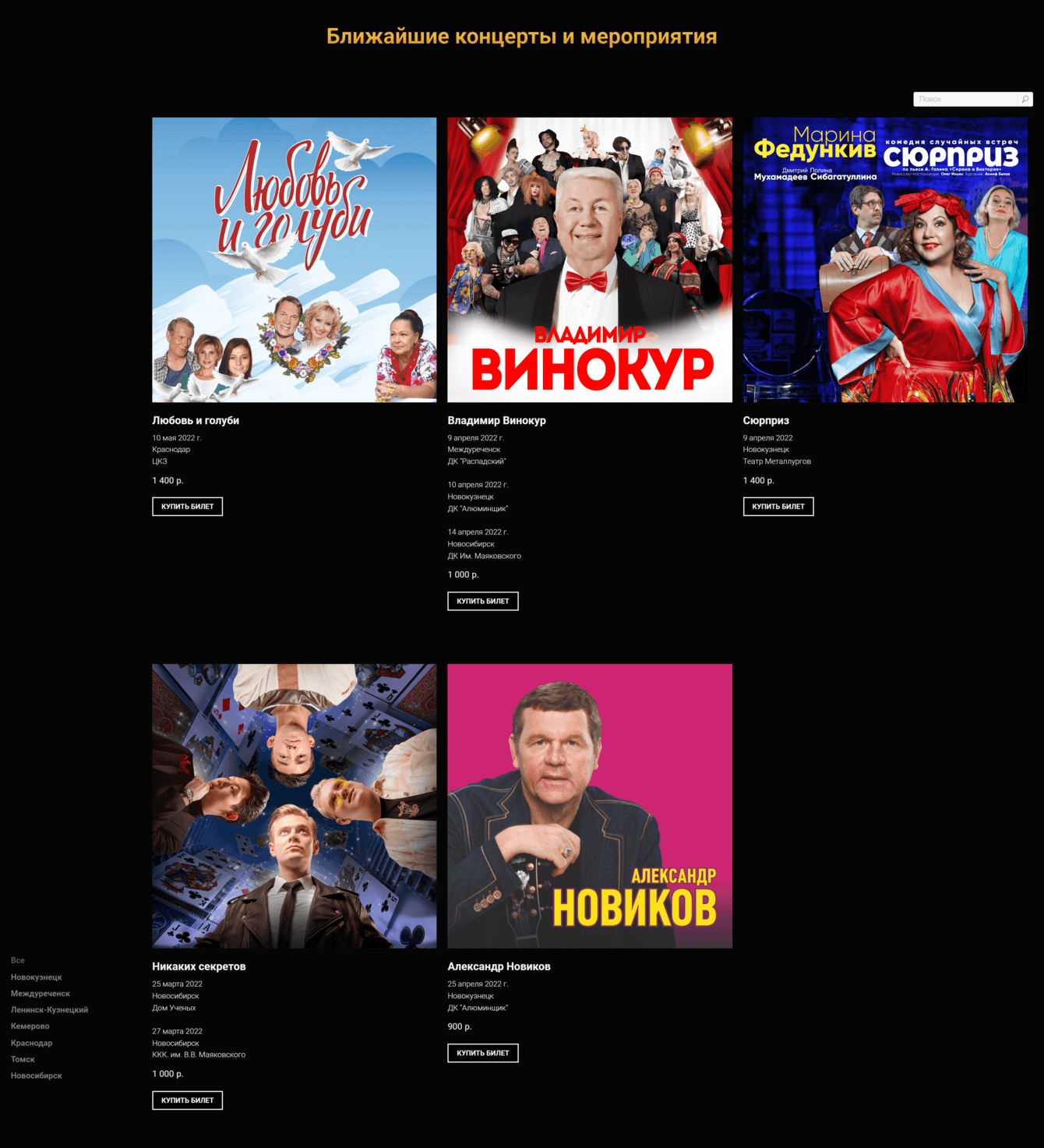 На котором будут помещаться все предстоящие мероприятия, и, у каждого мероприятия будет своя карточка с описанием и возможностью мгновенной покупки билета.