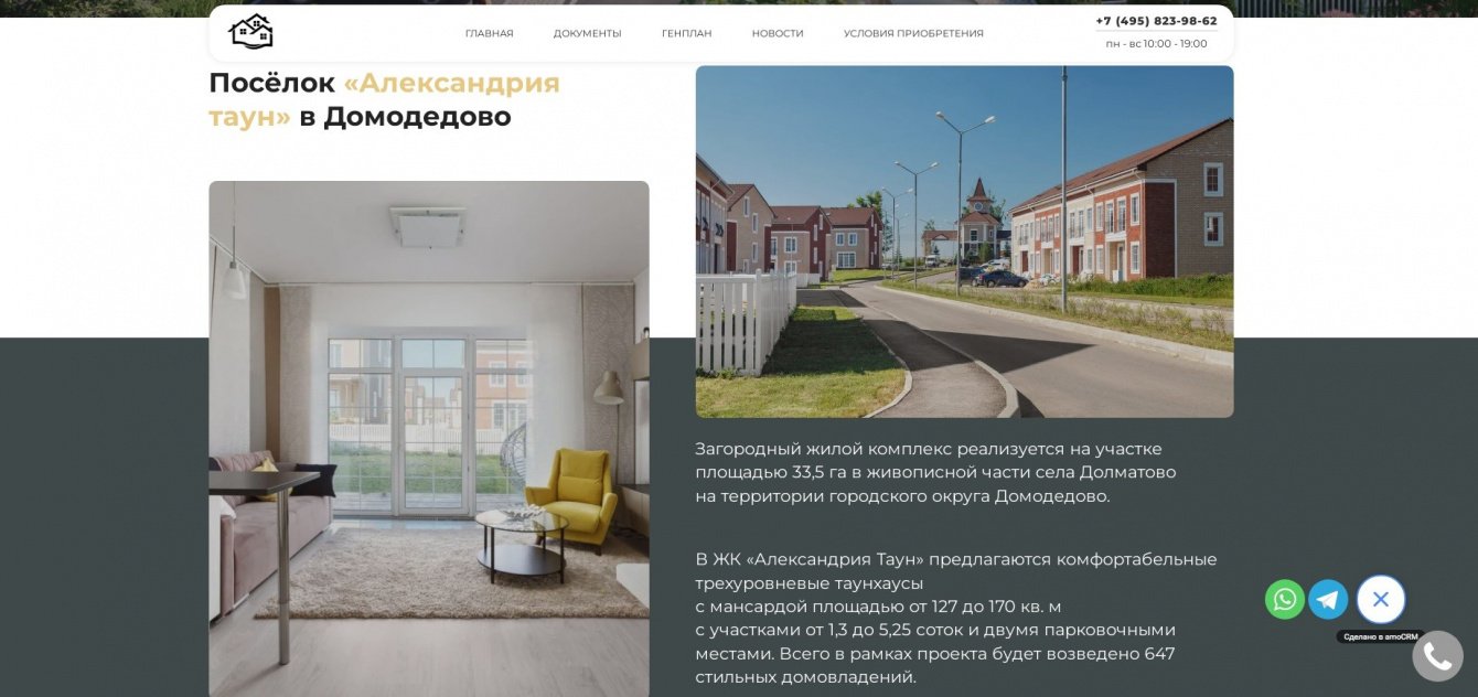 В результате нашей динамичной работы получился сайт, который нравится заказчику и отлично справляется со своими основными задачами по привлечению и информированию потенциальных покупателей недвижимости в КП «Александрия Таун». Все элементы дизайна интернет-ресурса обеспечивают формирование положительного имиджа компании и позиционируют ее как надежного партнера. Посетители сайта получают всю необходимую информацию по проекту и имеют возможность связаться с представителем компании удобным для себя способом: заказав обратный звонок, через онлайн-чат или с помощью мессенджеров.