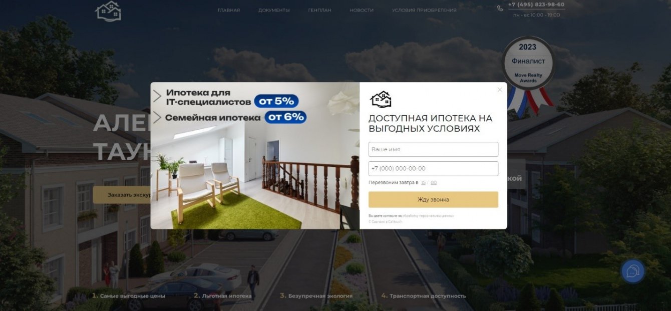 Особое внимание мы уделили конверсионным формам и расположению основных блоков на сайте, чтобы обеспечить максимальный комфорт для потенциальных клиентов и стимулировать их к совершению необходимых конверсий (звонок в компанию, запрос цены на конкретный объект, общение с представителем КП «Александрия Таун» через онлайн-чат, заполнение заявки на просмотр).