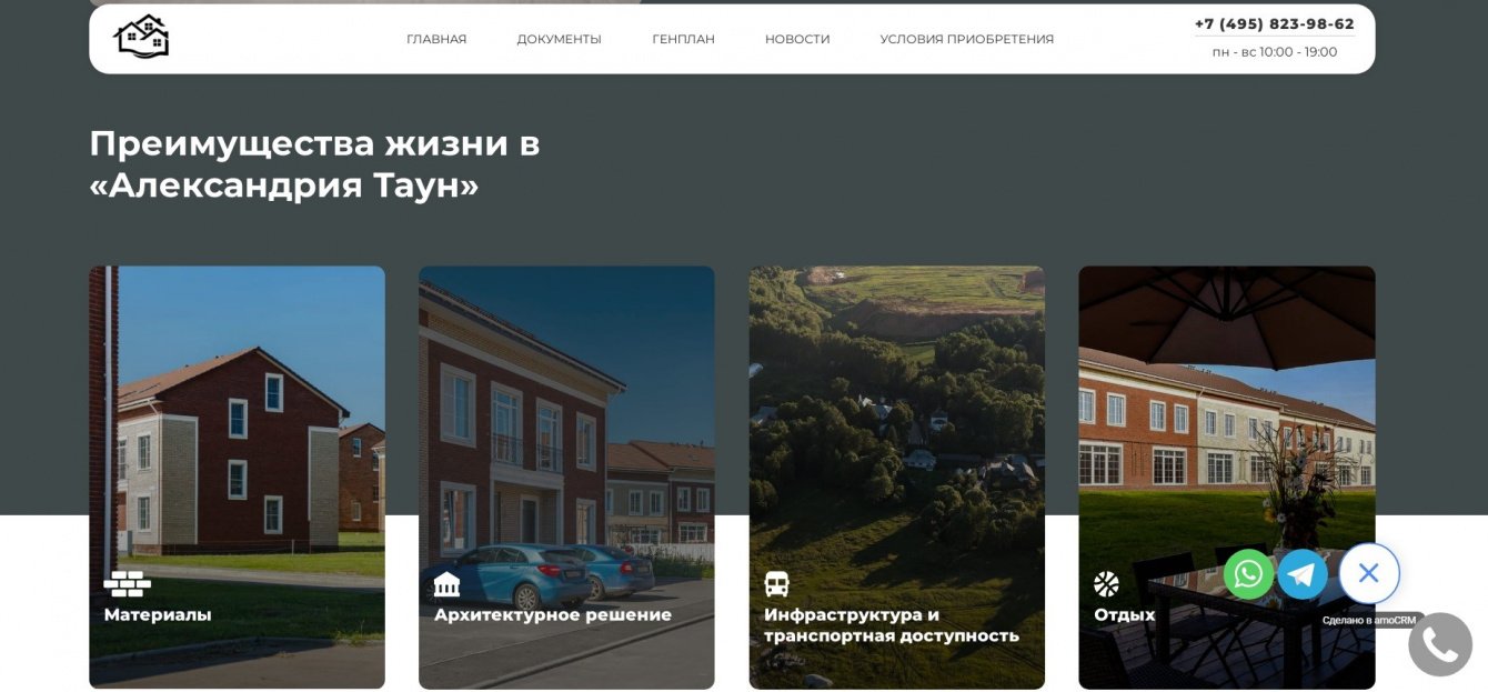 В результате нашей динамичной работы получился сайт, который нравится заказчику и отлично справляется со своими основными задачами по привлечению и информированию потенциальных покупателей недвижимости в КП «Александрия Таун». Все элементы дизайна интернет-ресурса обеспечивают формирование положительного имиджа компании и позиционируют ее как надежного партнера. Посетители сайта получают всю необходимую информацию по проекту и имеют возможность связаться с представителем компании удобным для себя способом: заказав обратный звонок, через онлайн-чат или с помощью мессенджеров.