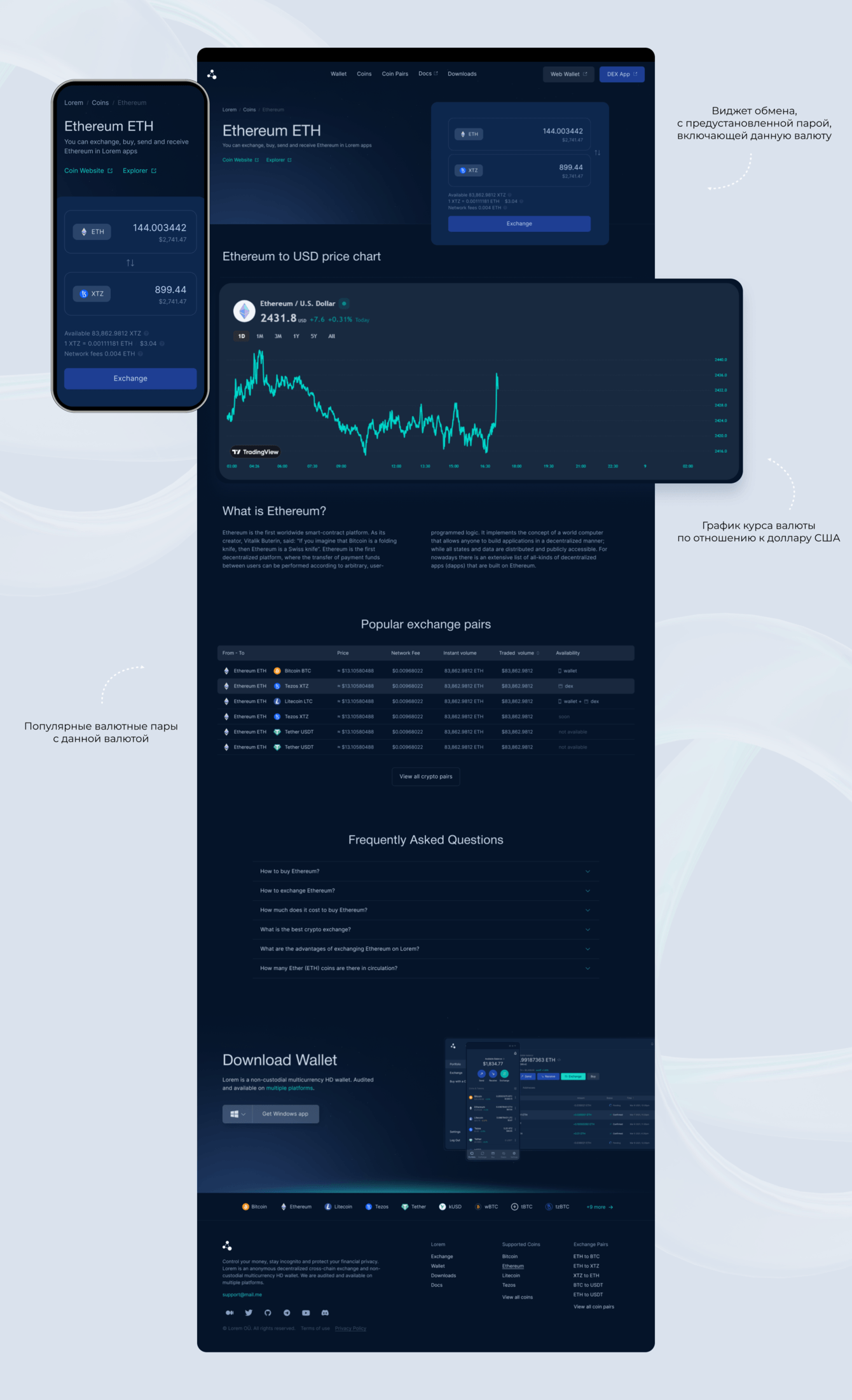Добавлен виджет обмена с предустановленной самой популярной парой, включающей данную валюту и кратким описанием. Из публичных источников подгружается рыночная информация о валюте и график ее курса по отношению к доллару США.
