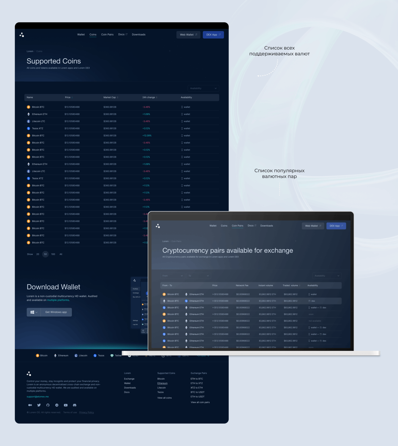 Блок со ссылками на скачивание кошелька под нужную платформу дублируется дважды: вначале и ближе к концу главной страницы. Так у пользователя появляется больше возможностей для скачивания.