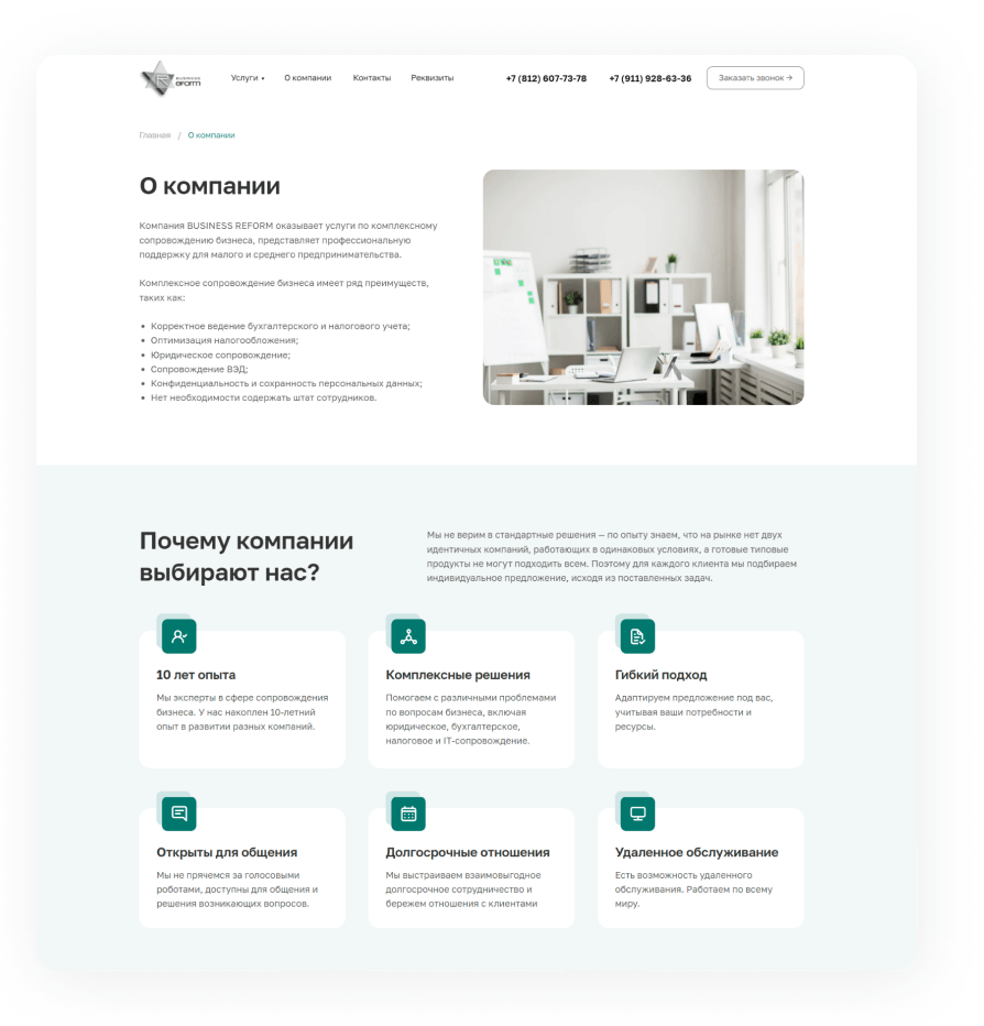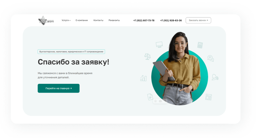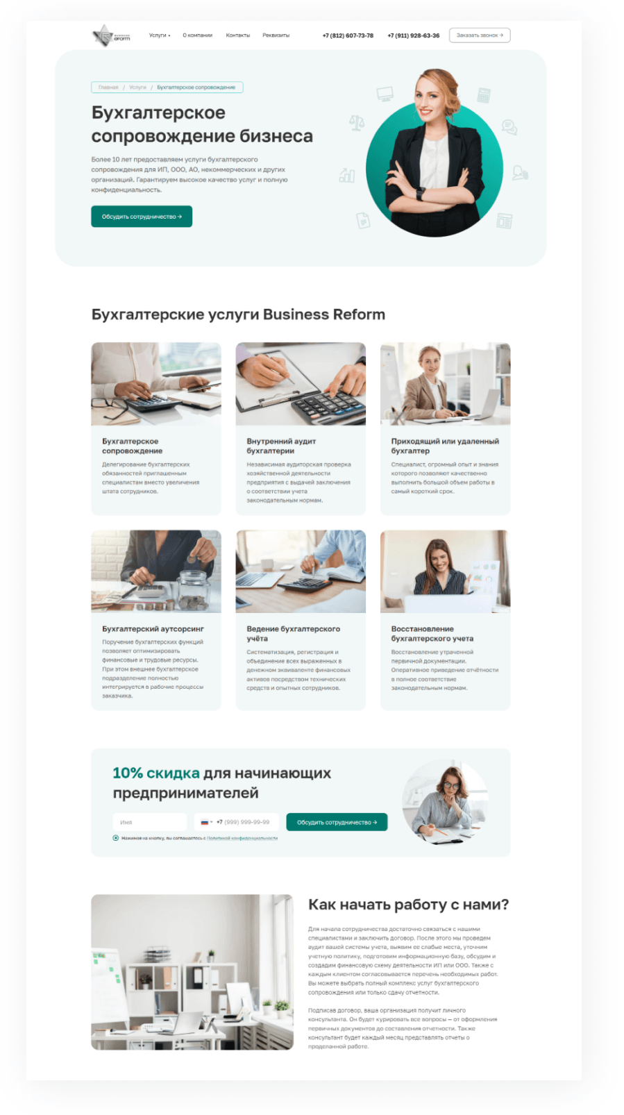 Для каждой из 22-х услуг создали страницу, где можно ознакомиться с описанием услуги, получить скидку и обсудить сотрудничество.