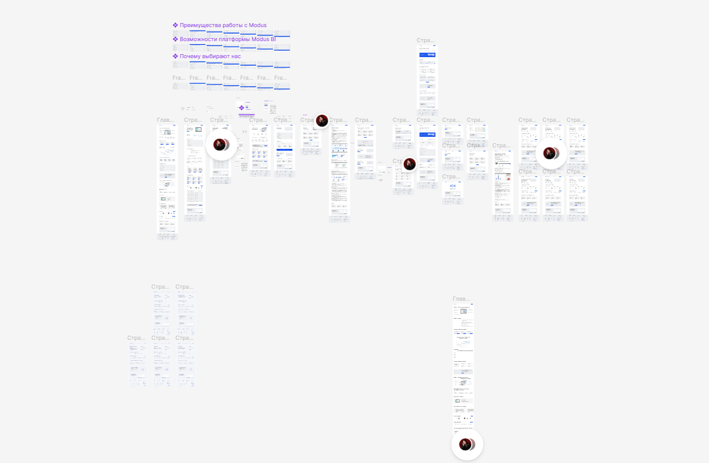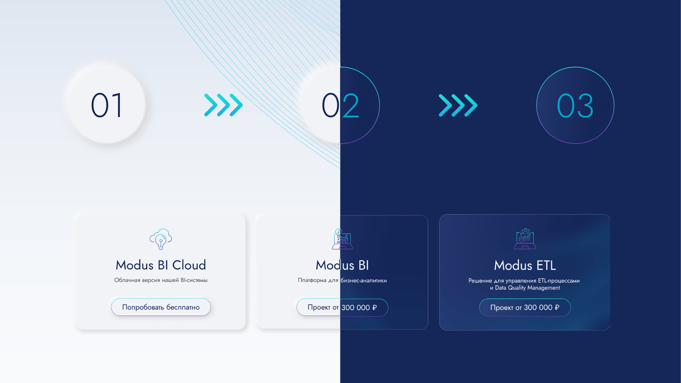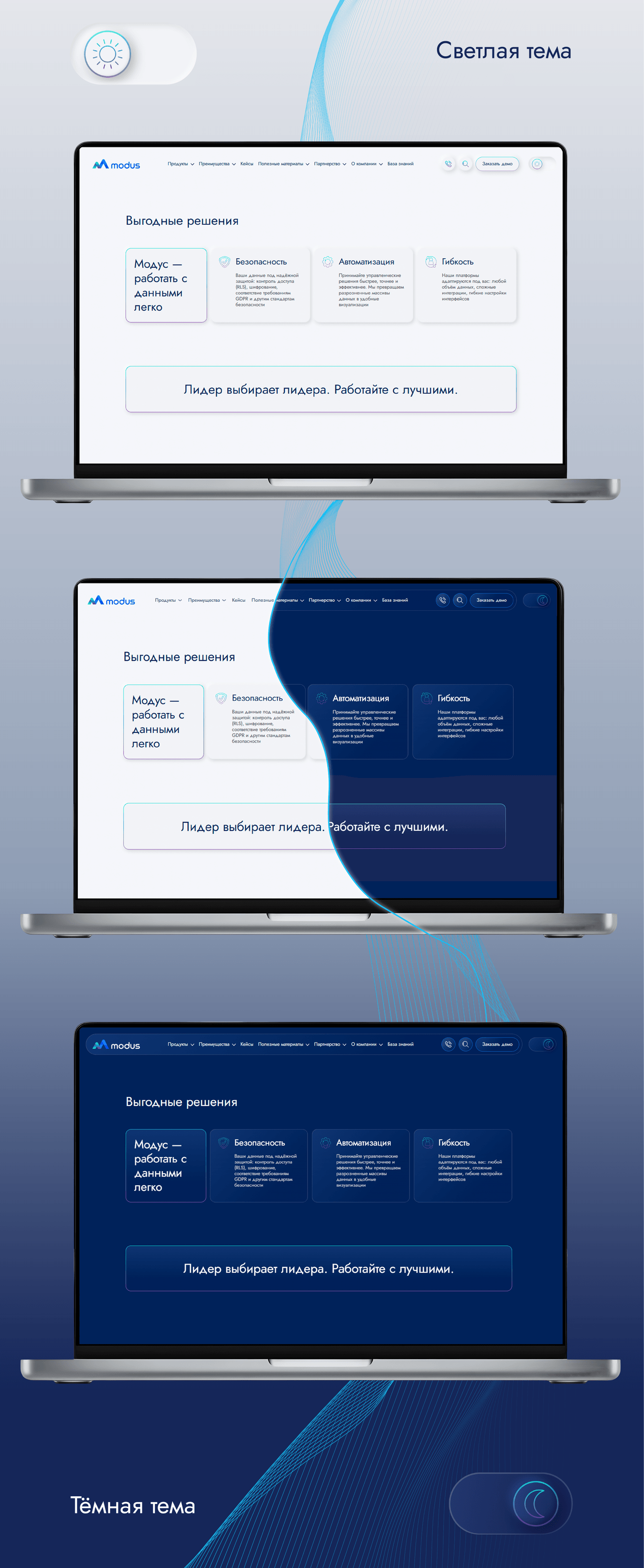 Мы предложили заказчику несколько концепций, из которых он выбрал две и решил внедрить их в функционал сайта в качестве светлой и темной темы. Дизайн ориентирован на деловую аудиторию, он информативен, но лишён визуального шума, что подчёркивает уверенность и зрелость бренда. Мы создали уникальные иллюстрации и детально проработали ключевые схемы, например, архитектуру платформы Modus ETL, для лучшего объяснения сложных концепций. Для проекта разработаны светлая и тёмная версии интерфейса. В светлой использован стиль neumorphism с чистой и воздушной палитрой, что создаёт ощущение ясности и открытости. Тёмная версия выполнена в стиле glassmorphism с использованием эффектов стекла, что подчёркивает технологичность и глубину продукта.