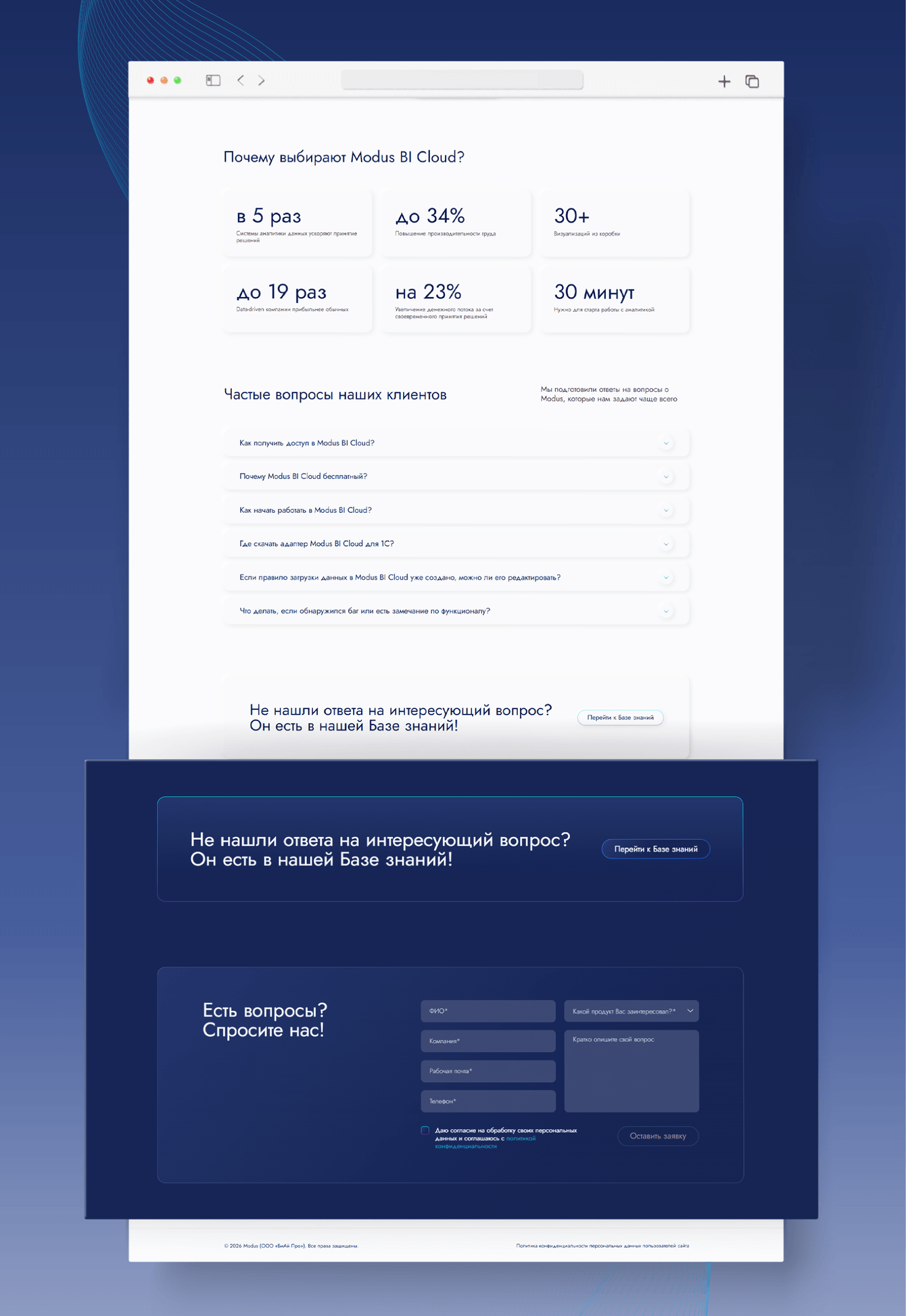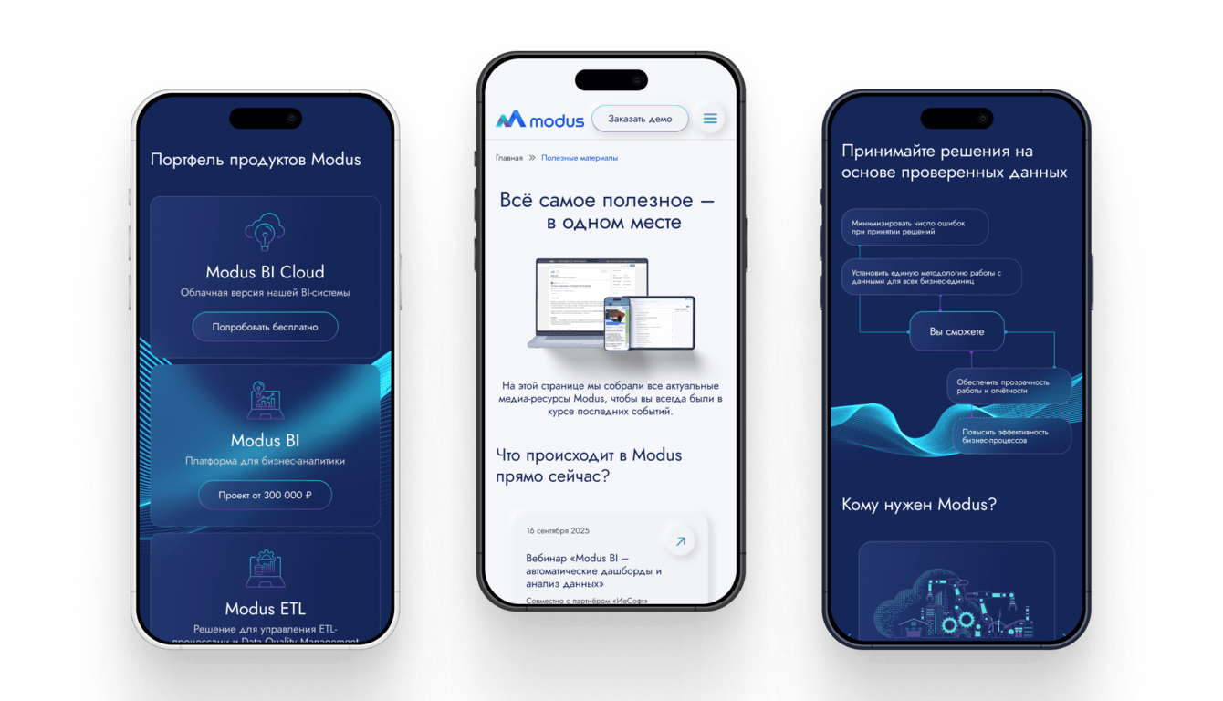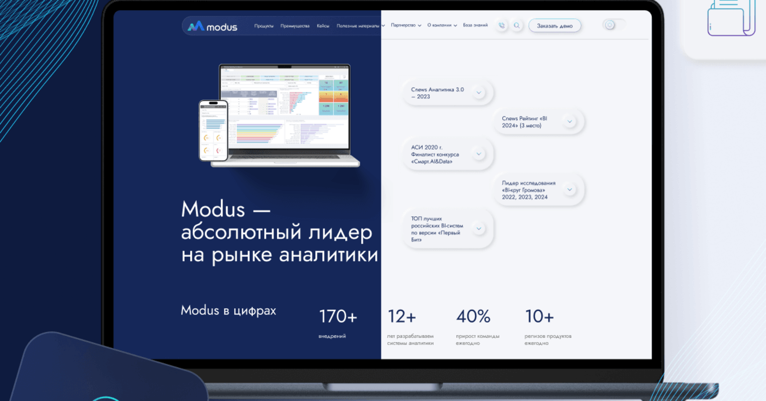 В рамках проекта для компании Modus был проведен полный редизайн сайта. В результате он имеет тщательно продуманную структуру, современный интерфейс основных страниц, удобный функционал и бесперебойную связь с CRM. Разработчики интегрировали все необходимые функциональные элементы. Дизайн-решение обеспечивает четкую и понятную презентацию продукта, а также отвечает целям привлечения корпоративных клиентов.