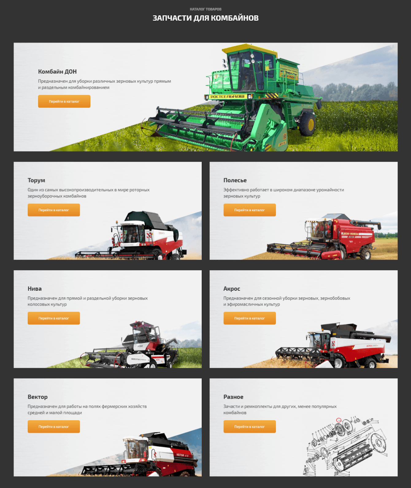 На следующем экране представлен каталог по видам техники. Здесь разместили графическое изображение и краткое описание типов комбайнов с кнопкой «перейти в каталог».