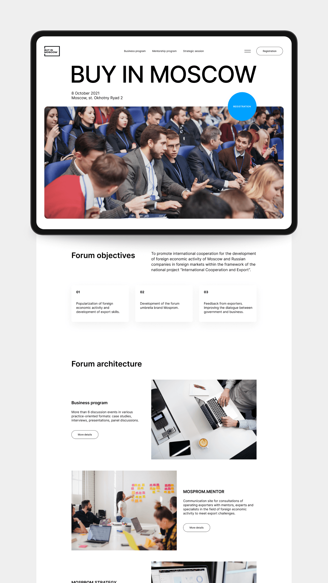 Необходимо было в кратчайшие сроки запустить промо-сайт для международного форума по экспорту. Сайт должен был быть оптимизирован под все устройства. Также был необходим ряд интеграций со стриминговыми сервисами и с сервисами рассылок.
