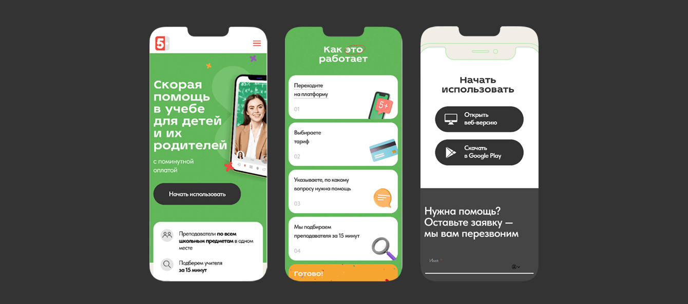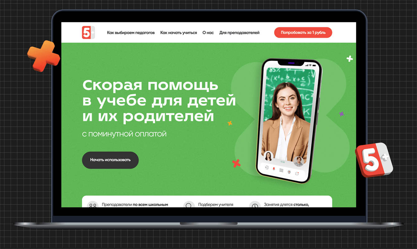 Разработать дизайн и сверстать привлекательную посадочную страницу для мобильного приложения «5 Plus». «5 Plus» — это сервис по подбору репетиторов, основным конкурентным преимуществом которого является возможность поминутной оплаты.