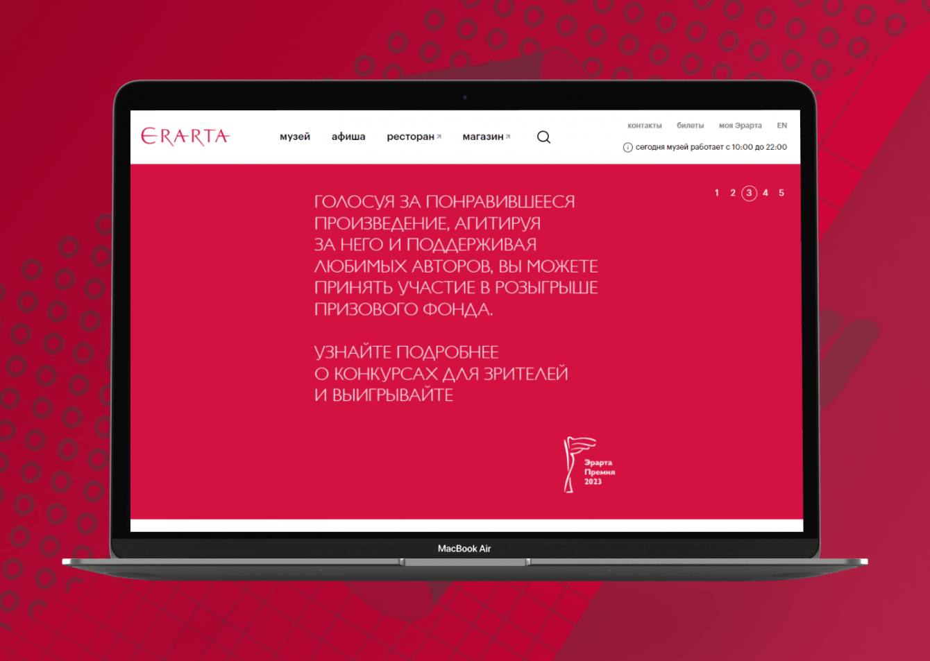Эрарта — крупнейший частный музей современного искусства России. Ведущие искусствоведы страны несколько лет скрупулезно собирали экспонаты для постоянной экспозиции. А в крыле для временных выставок ежемесячно организуют уникальные выставки отечественных и зарубежных художников. Это один из самых посещаемых музеев Санкт-Петербурга! И, конечно, ему нужен сайт — такой же тонкий, интересный и продуманный до мелочей.