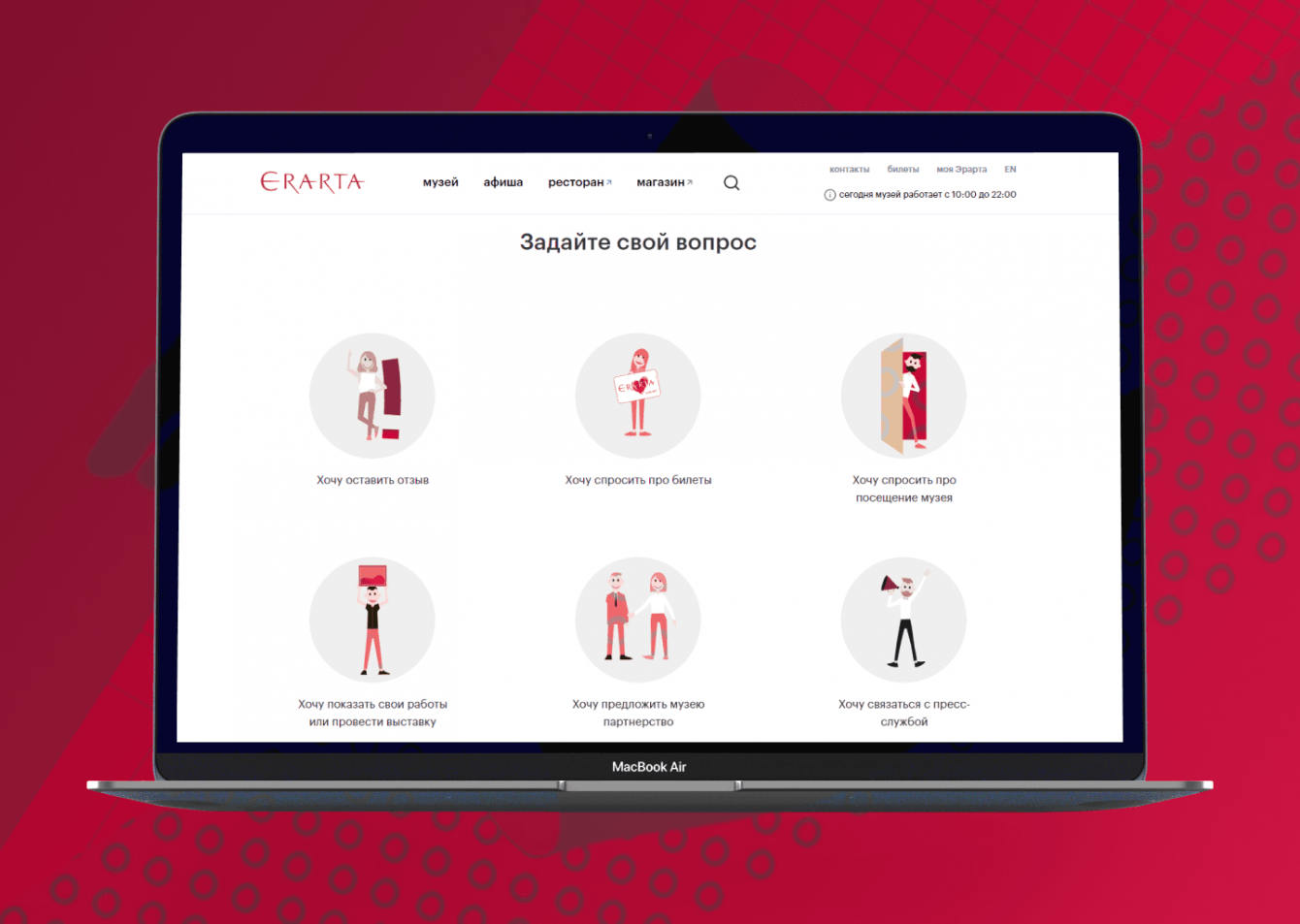 В 2018 году мы взялись за этот проект. Сайт должен помочь посетителям Эрарты узнавать о новых выставках и их организаторах, а также покупать билеты и абонементы онлайн, чтобы не стоять в очереди на кассу. А еще у Эрарты есть свой магазин, в котором представлены работы перспективных художников и скульпторов — его тоже предстояло перенести в онлайн.