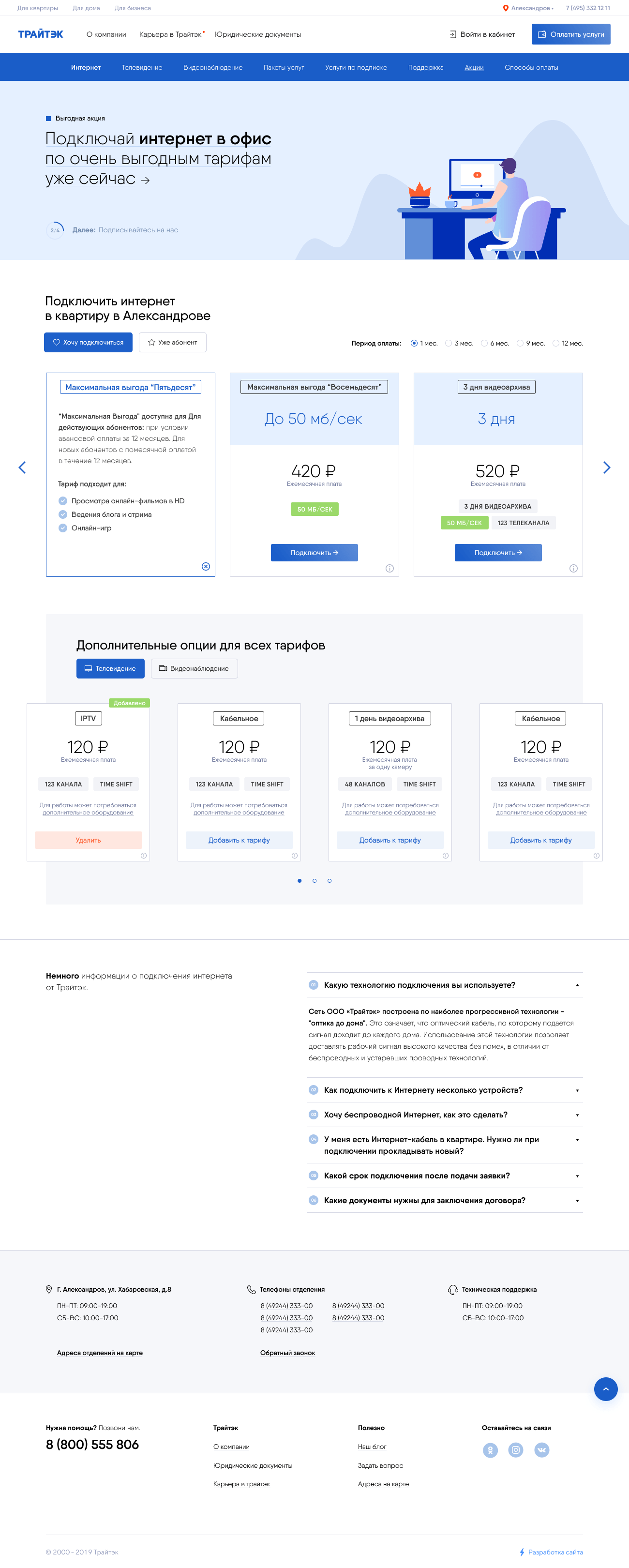 Наша работа имеет огромное количество нюансов. В каждом городе, где мы присутствуем, ООО «Трайтэк» практикует индивидуальный подход к абонентам — собственный офис обслуживания, различные наборы оборудования на витрине. Все эти нюансы необходимо было отразить не только в основной версии сайта, но и в мобильной.