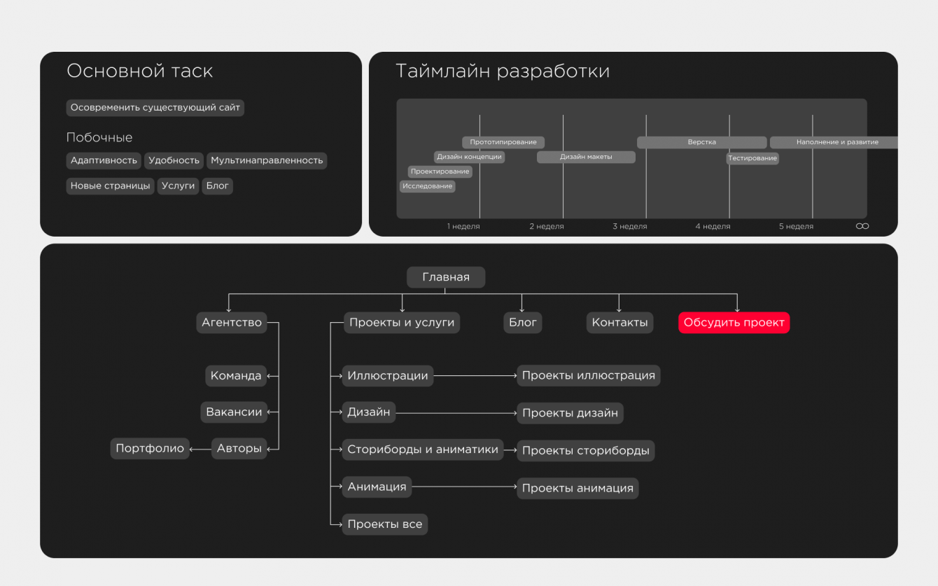 Мы обсудили основные составляющие будущего сайта с командой и выделили необходимые разделы, составив карту. Нам было важно найти баланс: сайт должен показывать, кто мы такие и чем мы занимаемся, при этом оставаясь компактным. Когда была придумана идеальная схема, мы составили таймлайн и приступили к разработке.