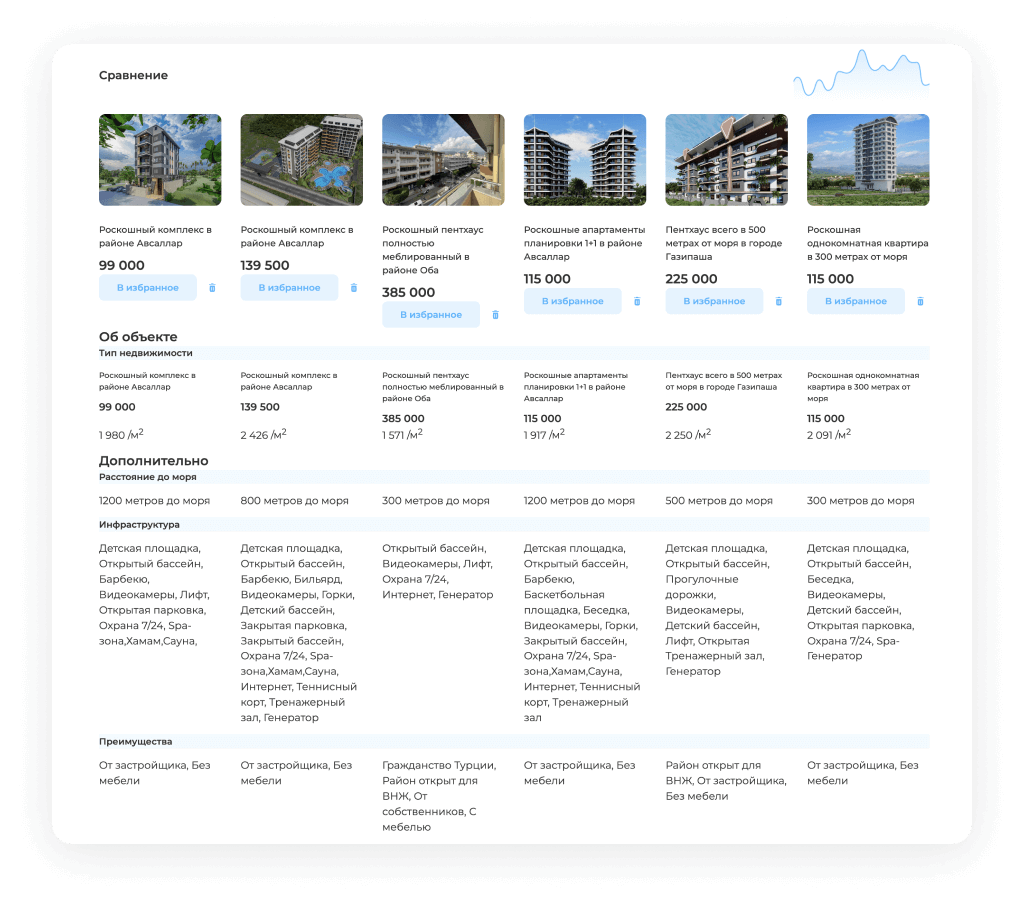 Во время проектирования мы ориентировались на удобство выбора недвижимости, в таком случае без сравнения объектов обойтись было нельзя.