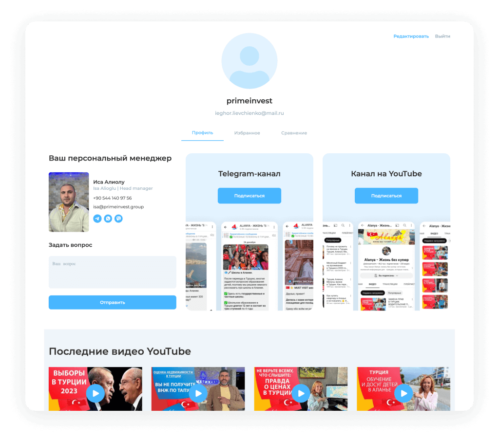 Каждому зарегистрированному пользователю прикрепляется личный менеджер, которому через сайт можно отправлять вопросы, ответ придёт на указанную почту.
