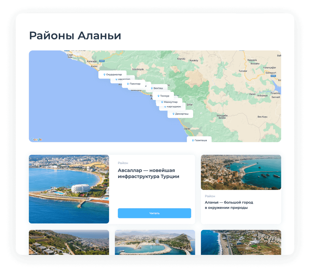 Интерактивная карта на сайте с районами в Аланьи помогает наглядно понять, какая недвижимость вам больше подходит.
