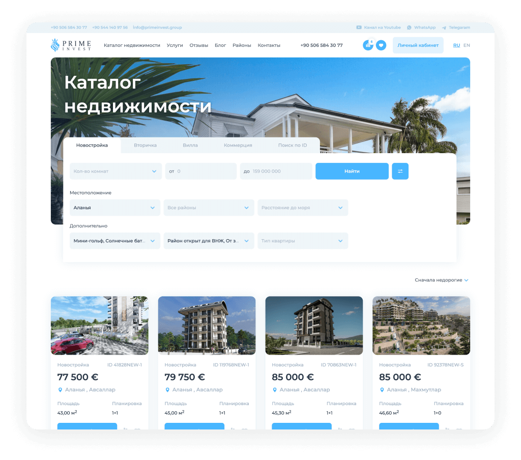 На сайте мы реализовали удобный каталог с фильтрами для быстрого поиска по требующимся характеристикам недвижимости.