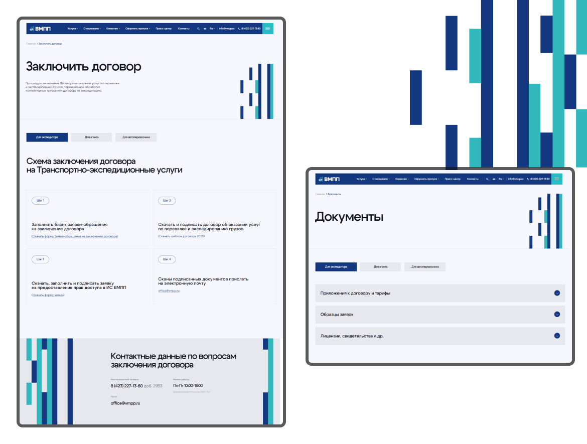 Мы учли разные целевые группы: действующие и потенциальные клиенты, партнеры, акционеры и инвесторы, заинтересованные в работе кандидаты, СМИ. Все найдут нужную для себя информацию, что делает сайт универсальным ресурсом. В разделе «клиентам» для потенциальных и существующих клиентов разместили информацию о порядке заключения договора, все необходимые типовые бланки. Для каждого вида договора создали свои вкладки: для экспедитора, для агента, для автоперевозчика.