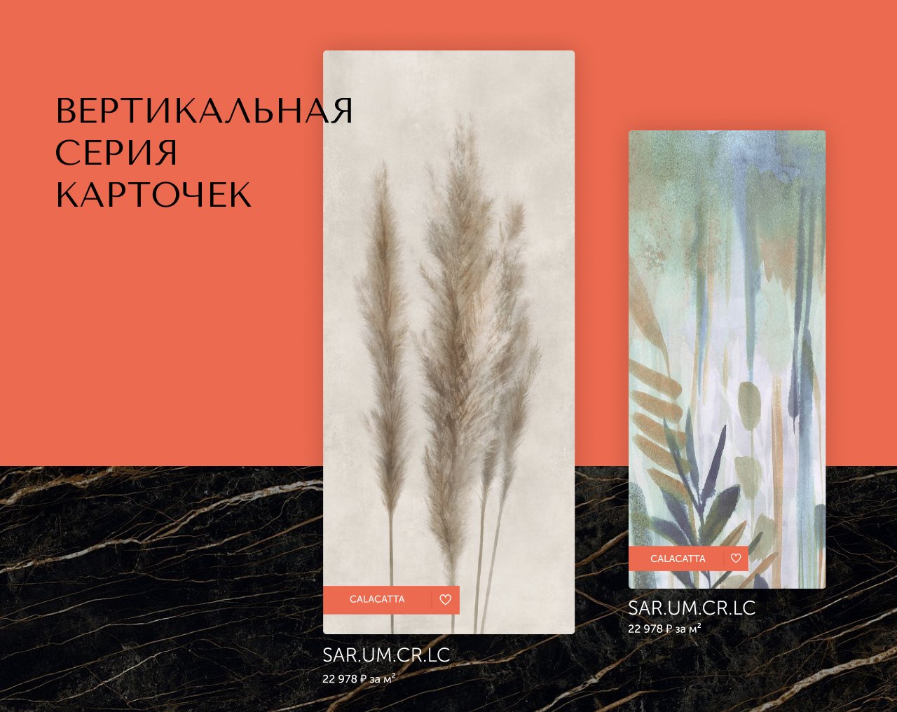 В одном из разделов (DECO) мы реализовали вертикальную серию карточек, чтобы лучше продемонстрировать визуальные характеристики определенных плит и их пропорциональные отличия от других коллекций.