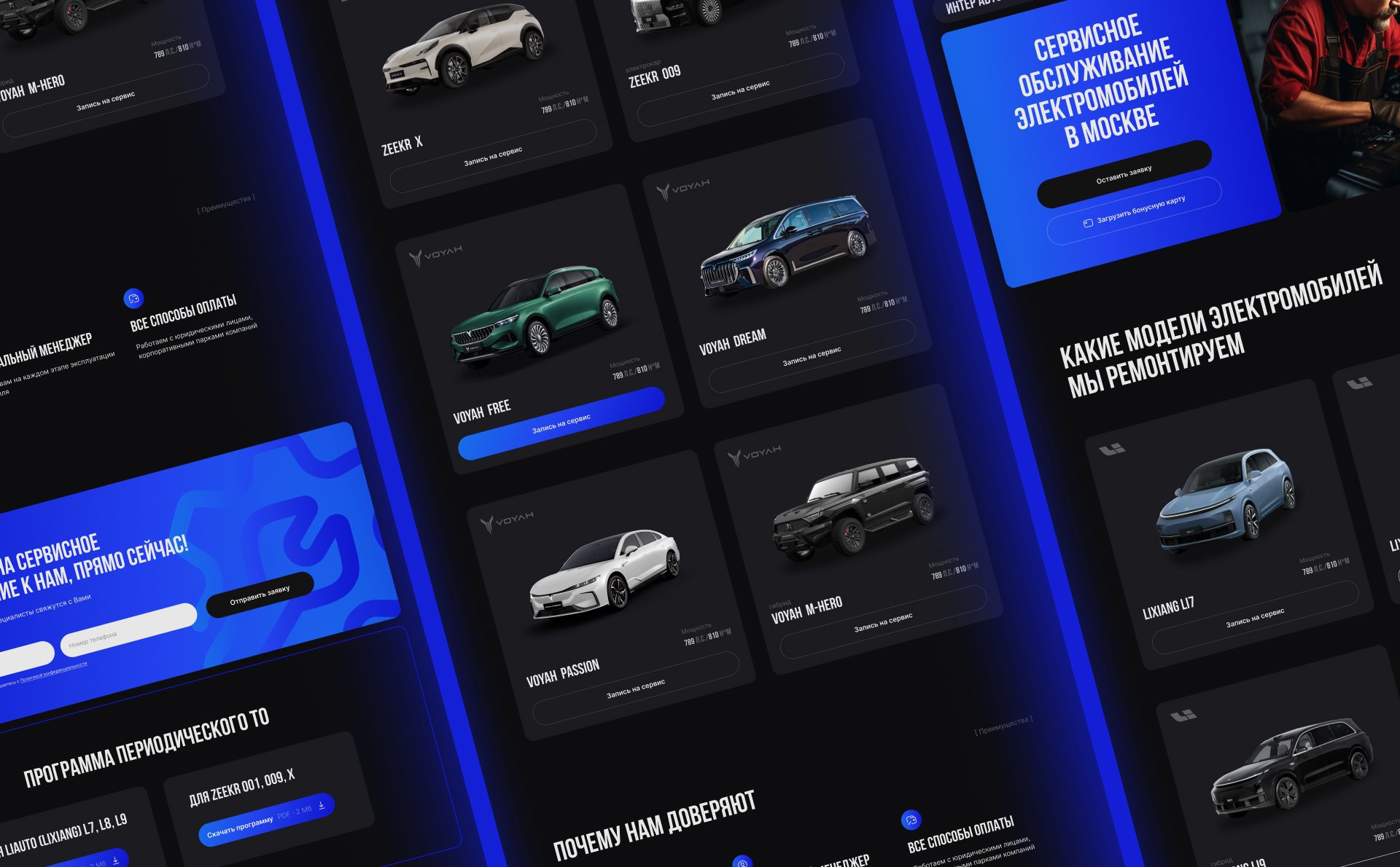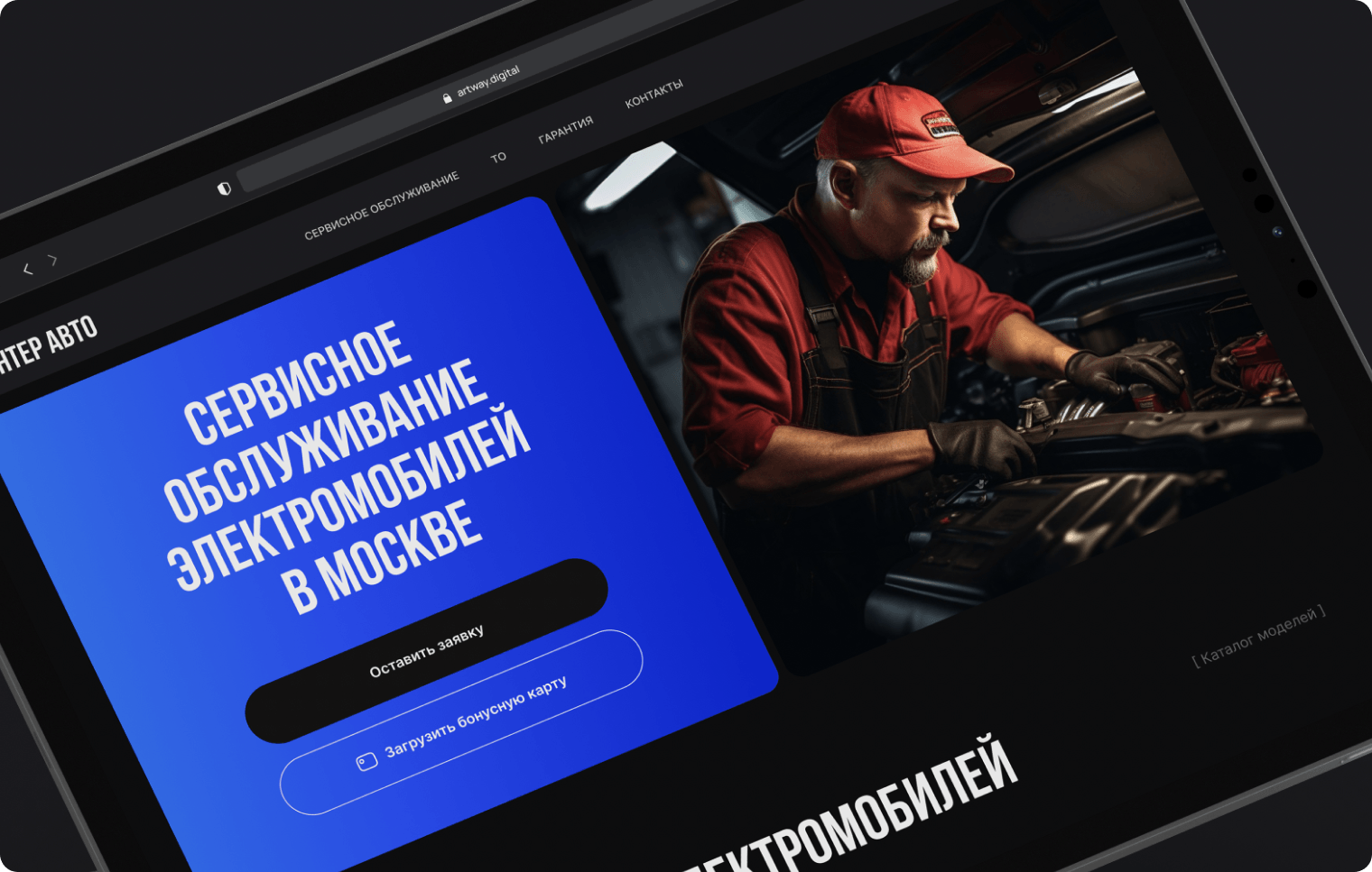 Для сервисного центра по ремонту и обслуживанию электромобилей мы разработали одностраничный сайт на платформе Tilda. Учитывая, что потенциальные клиенты часто ищут сервис в спешке, мы создали лаконичный лендинг без избыточных текстовых описаний, сосредоточив внимание на ключевой информации. Дизайн выполнен в тёмных тонах с акцентными синими градиентами и массивным шрифтом, придающими сайту технологичный вид. На главном экране размещены только заголовок, кнопки и тематическое фото, сгенерированное нейросетью, что позволило сэкономить время и бюджет клиента. Сайт адаптирован для корректного отображения на различных устройствах и был спроектирован и разработан за 10 рабочих дней.