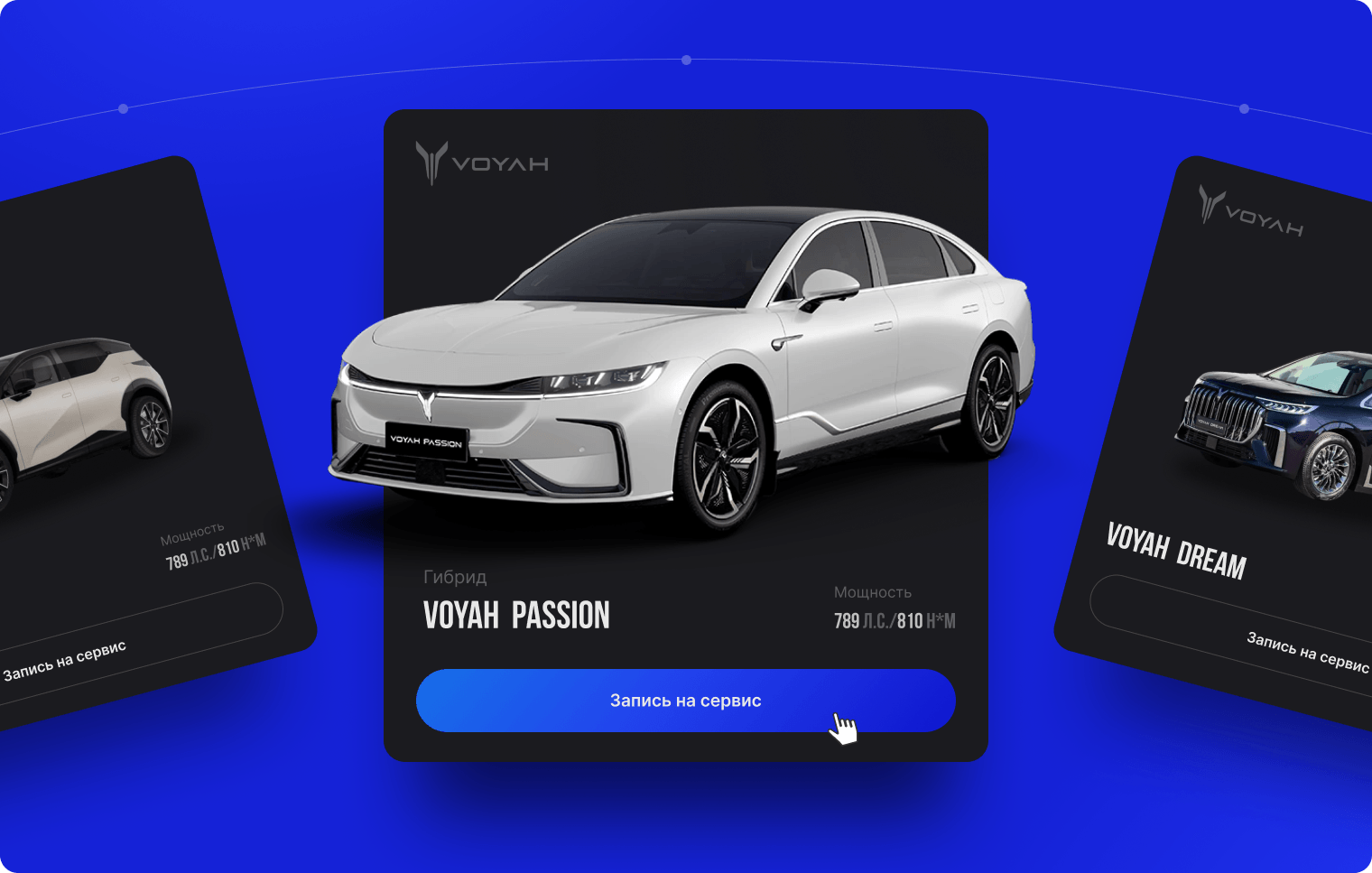 Тех клиентов, кто проскроллит сайт далее главного экрана, встретят карточки со списком обслуживаемых моделей. Здесь тоже всё очень просто. Изображение, название и эмблема модели, мощность (так проще определить двигатель, чем различать сложные модификации из символов), пометка если машина «гибрид», кнопка.