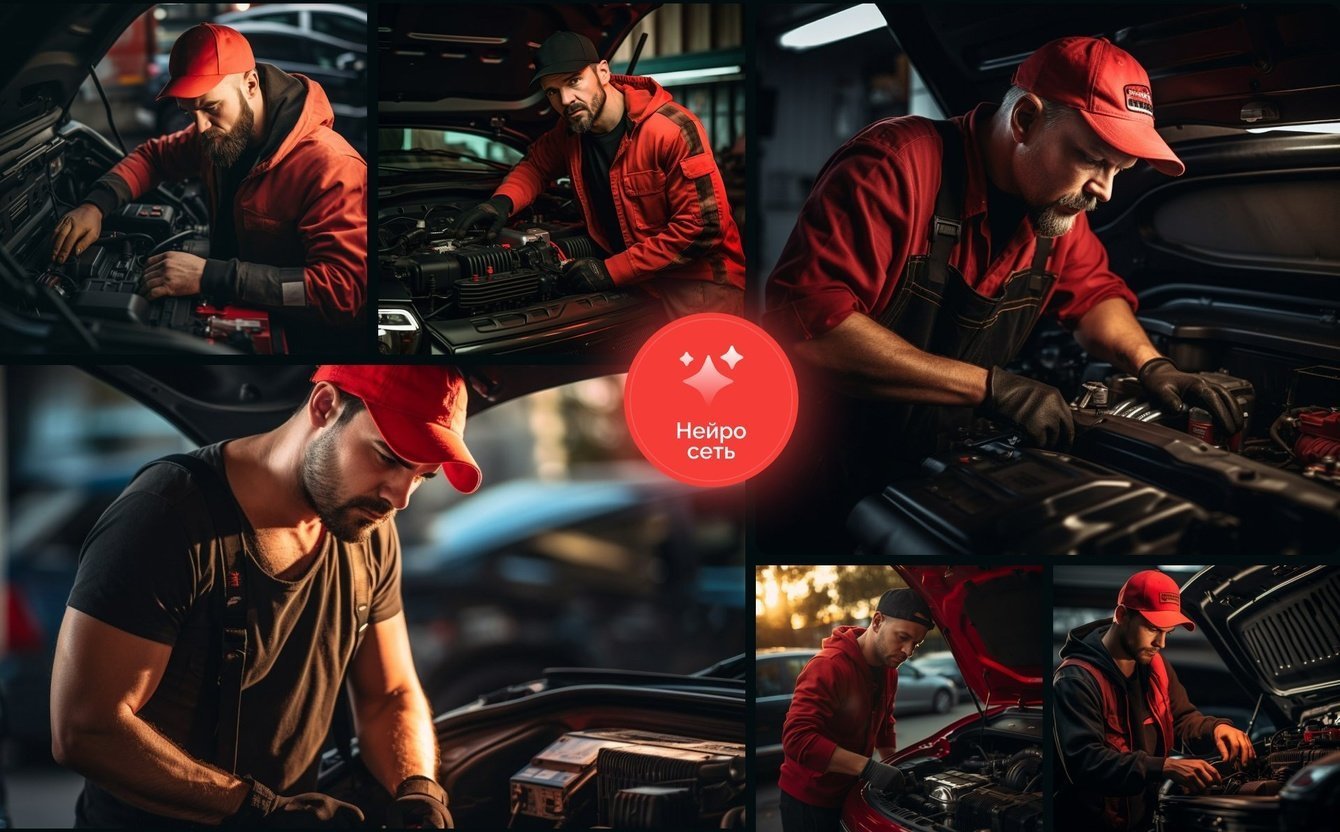 Кстати, фото сгенерированное нейросетью, сэкономило бюджет и время клиенту. Требовалось отобразить автослесаря с бородой (но не очень длинной), в спецодежде красного цвета (в комбинезоне, не в куртке), в перчатках и кепке работающего под капотом авто. На стоках было бы сложно отыскать фото под подобные запросы, да и цены на стоки в разы выше, чем на генерацию нейронок.