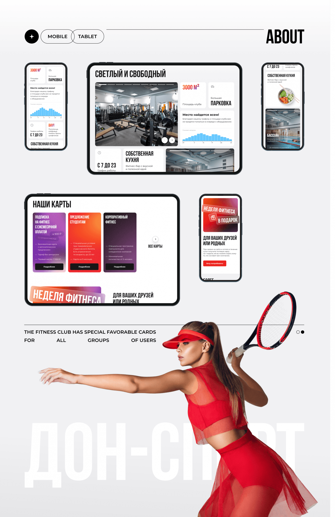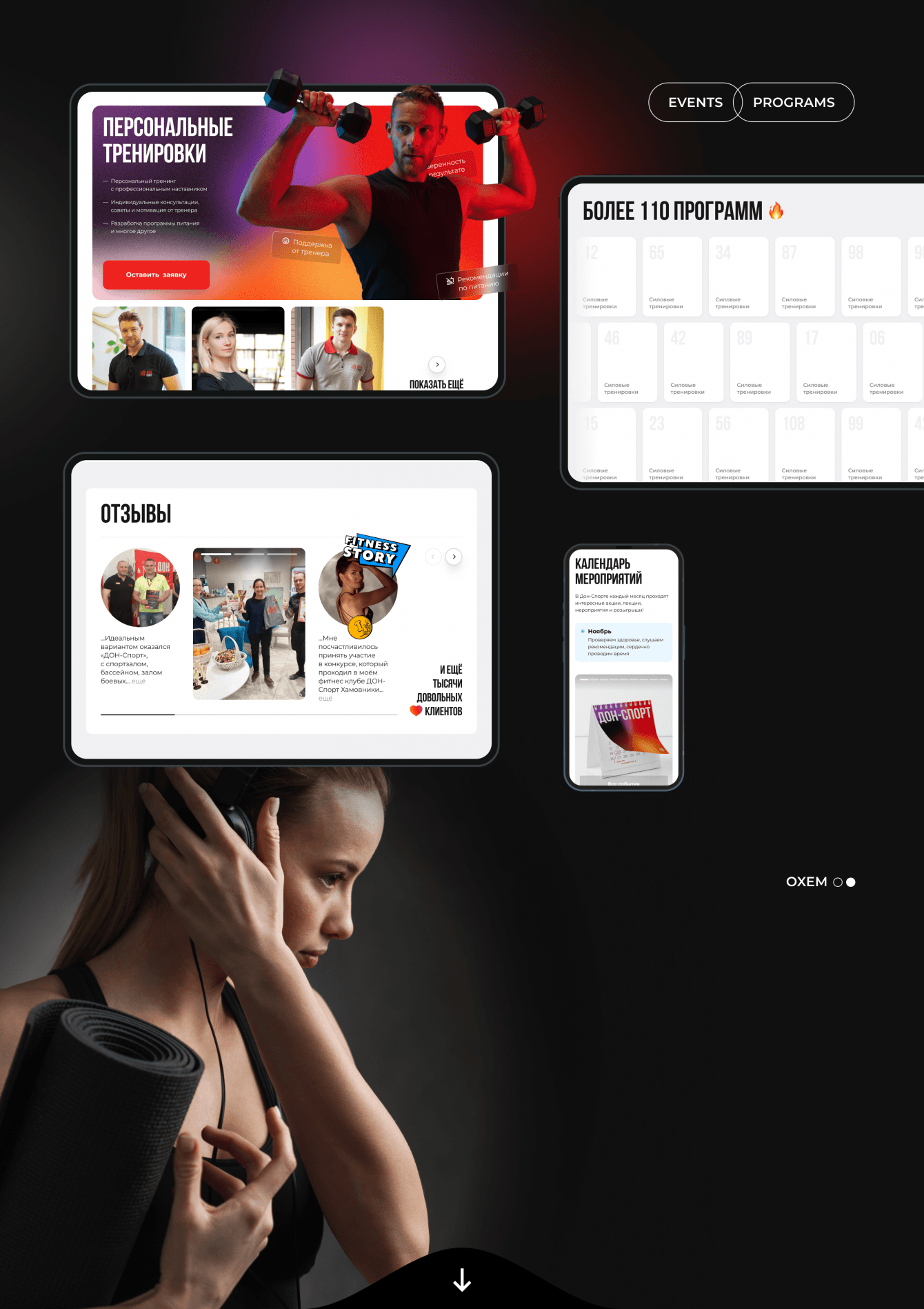 Разработали для ДОНСПОРТ основной сайт компании. Сделали акцент на комфорте тренировок в клубе. Перечислили все преимущества клуба иллюстрируя каждый пункт фотографиями, числами или графиком. Помимо этого в клубе часто проходят разные мероприятия и акции, для этого сделали отдельный блок с отзывами клиентов и расписанием