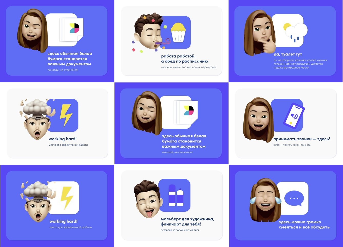 Чтобы передать дружелюбность атмосферы и наполнить концепцию жизнью, добавили memoji. Они выполняют роль дружелюбного цифрового помощника в коворкинге, где нет персонала.