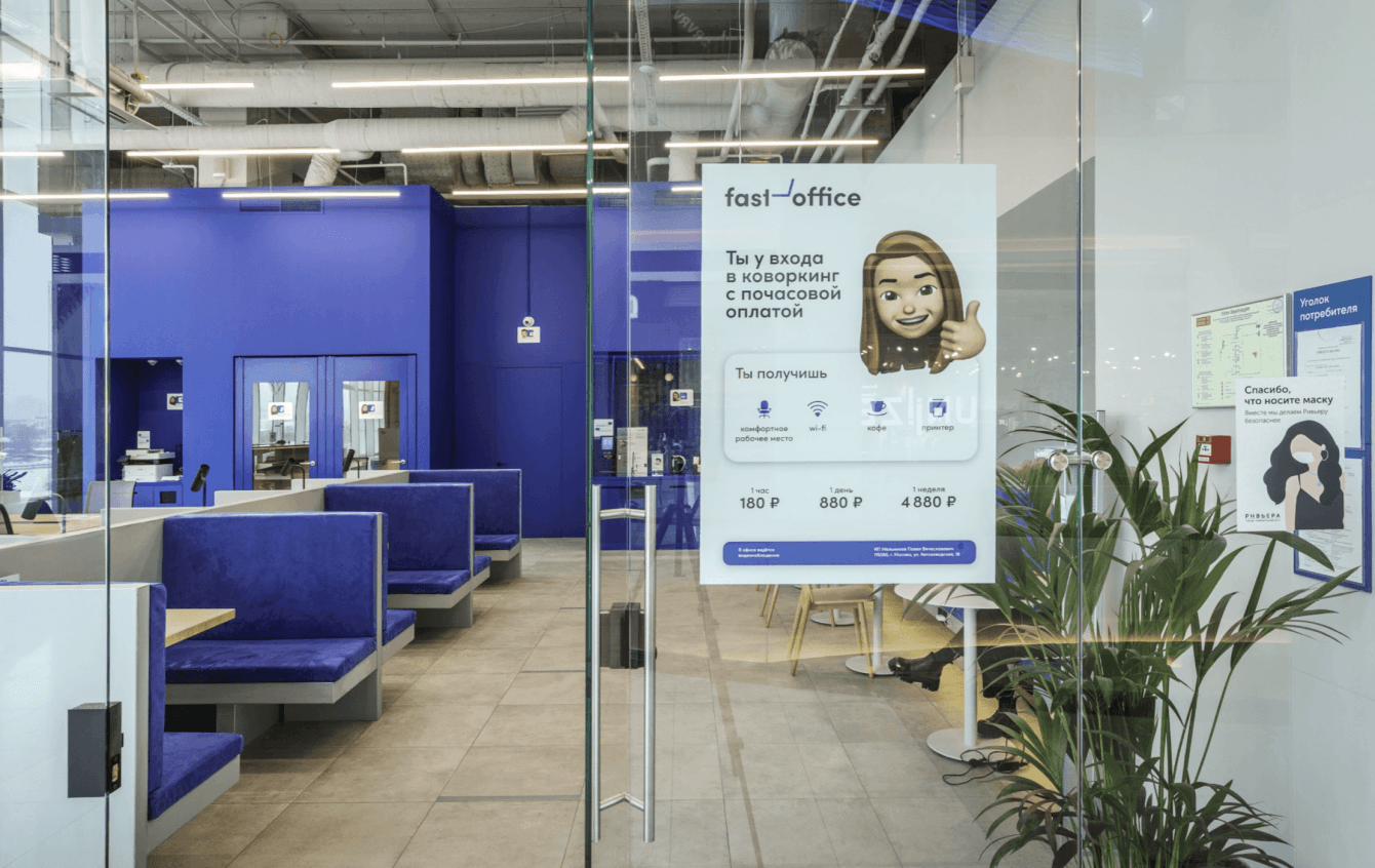 Fast Office разработали концепт удобного и современного места для работы. Суть проекта — пользователь получает полноценный офис в ближайшем к дому торговом центре, которым может пользоваться, когда ему нужно без долгосрочных подписок, привязке к конкретным локациям и т д.