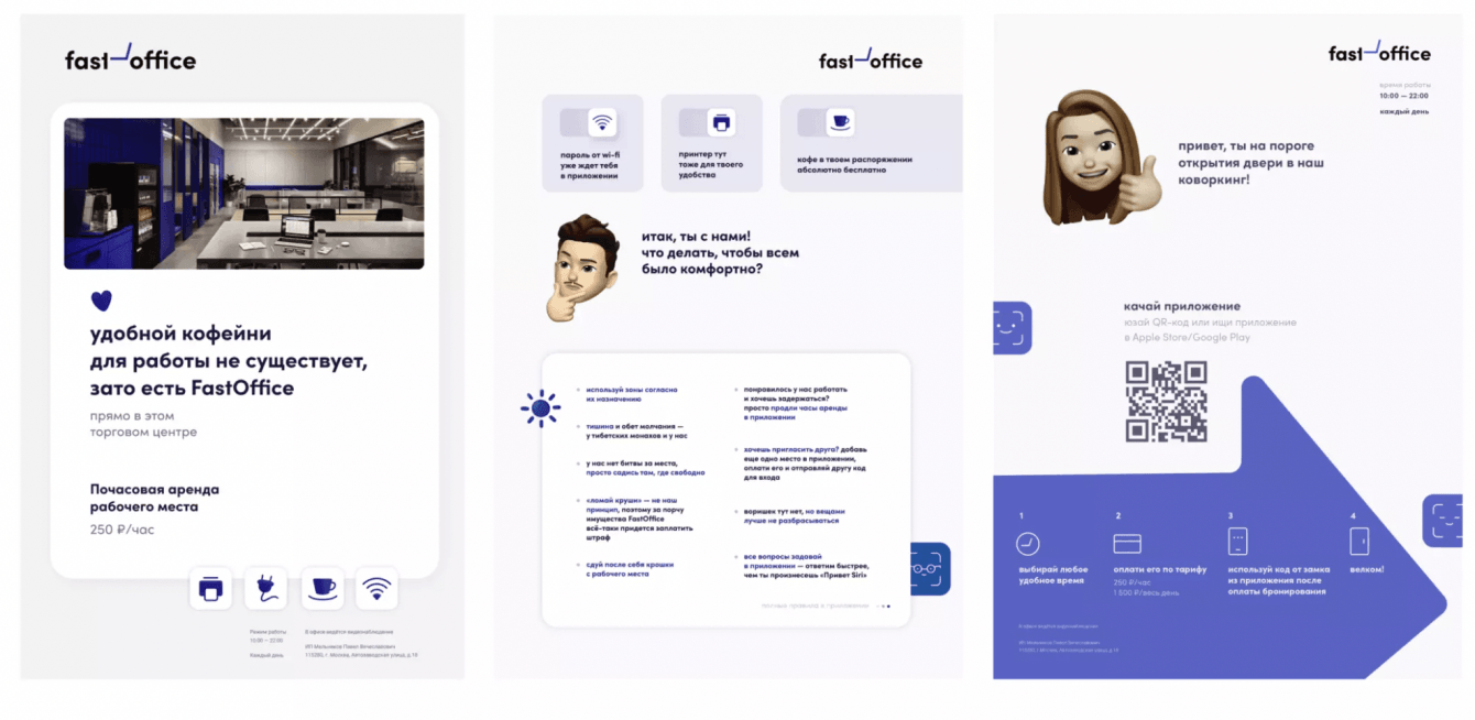 – технологичности проекта (коворкинги работают без персонала, бронирование и оплата происходят через приложение);