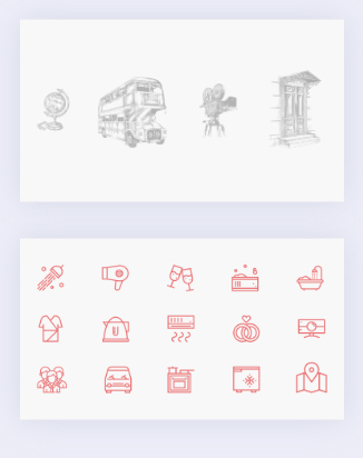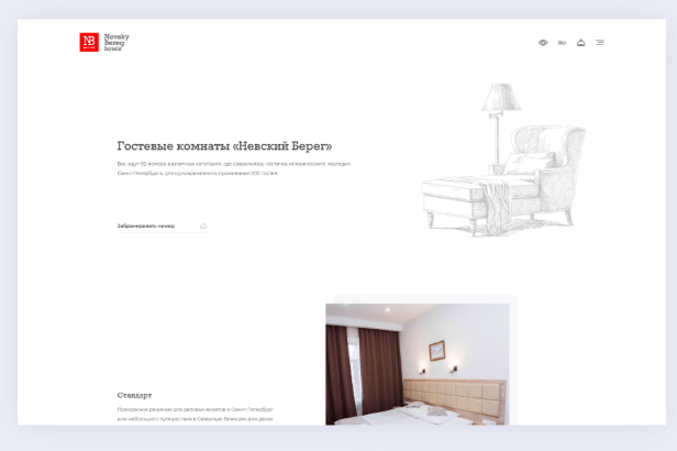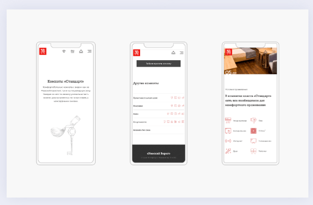 При разработке дизайна важно было подчеркнуть несколько моментов, включая территориальное расположение и ламповость. Отсюда появилась идея графической отрисовки отелей с элементами современного мира и старины. В самом дизайне был сделан упор на простоту и лёгкость.