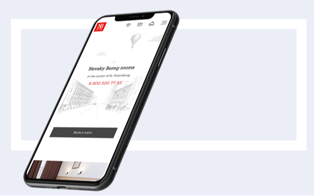 Разрабатывая мобильную версию сайты, мы отталкивались от удобства как новых посетителей, так и текущих. Соответственно, мы вынесли самую важную информацию наверх, а первый экран сайта даёт сразу возможность связаться с отелем или забронировать номер.