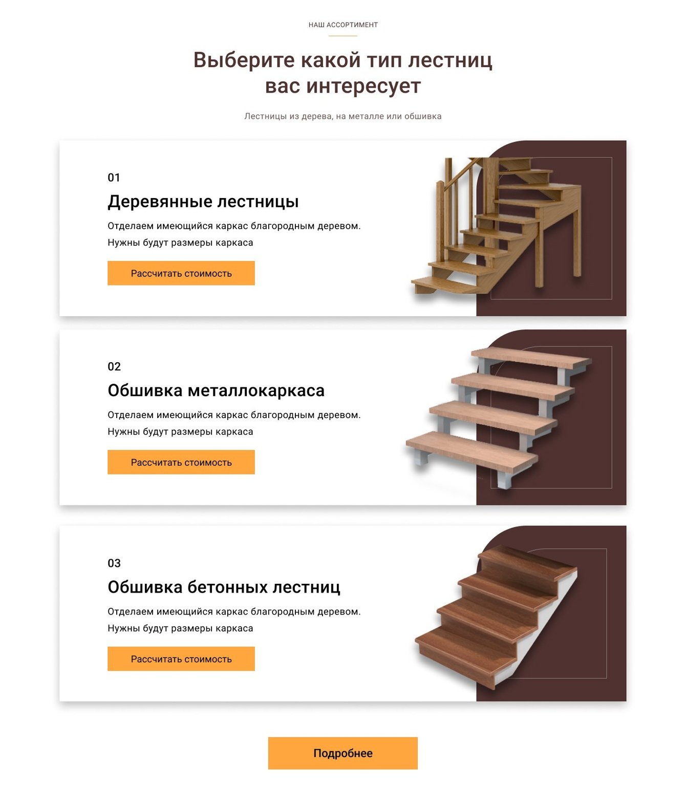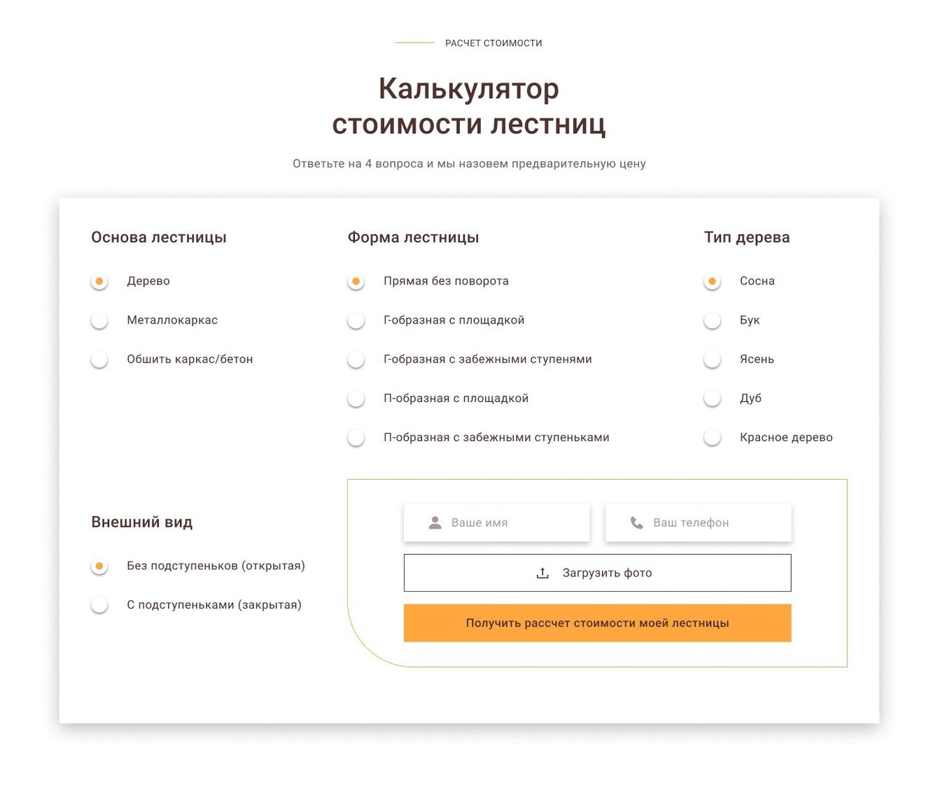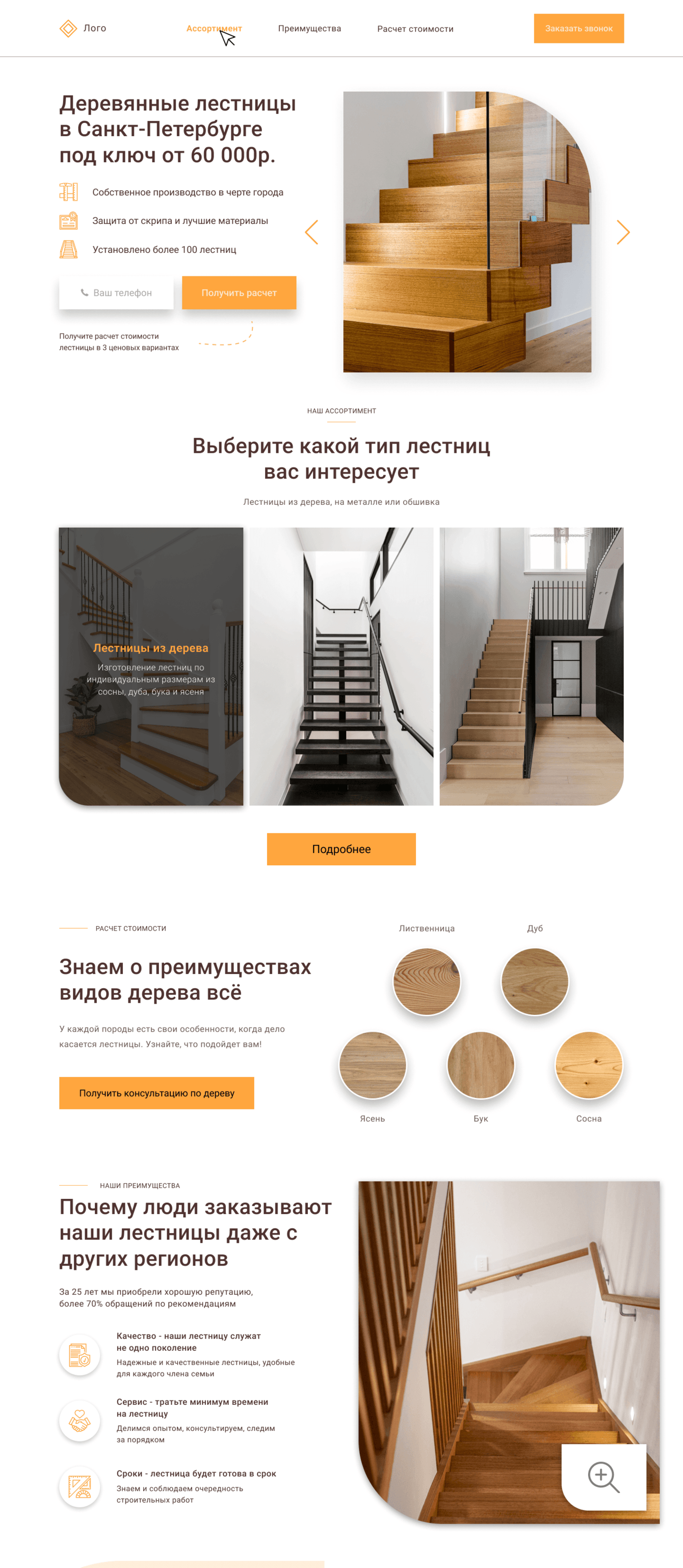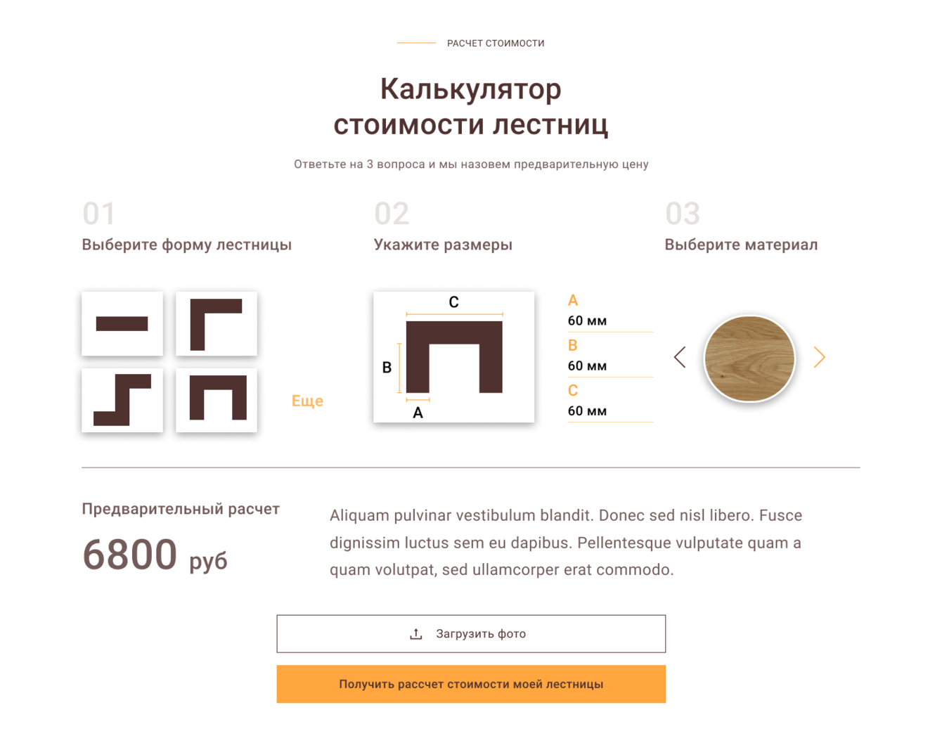 Перед нами встала задача разработать сайт-каталог с индивидуальным дизайном, также был запрос на удобный для пользователя калькулятор в составе сайта. На сайте планировалось размещать примеры работ, однако это не был интернет-магазин, а именно каталог с примерами работ, потому что все запросы на мебель и лестницы шли под заказ.