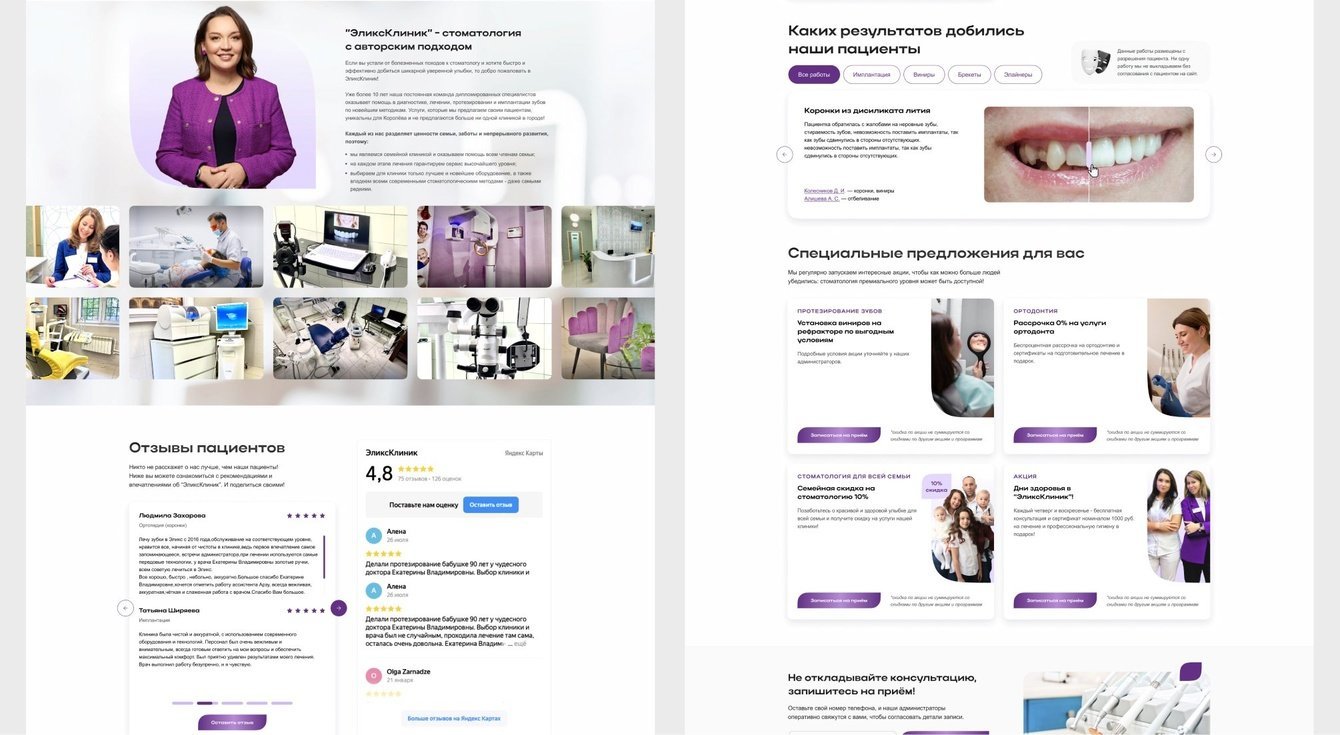 Нашей команде удалось создать для «ЭликсКлиник» стильный, современный и удобный сайт, который в своей информативности не уступает многостраничным ресурсам. Весь контент структурирован и лёгок для восприятия. А понимание маркетинговых нюансов в медицинской нише помогло нам и в формировании доверительного отношения к бренду.