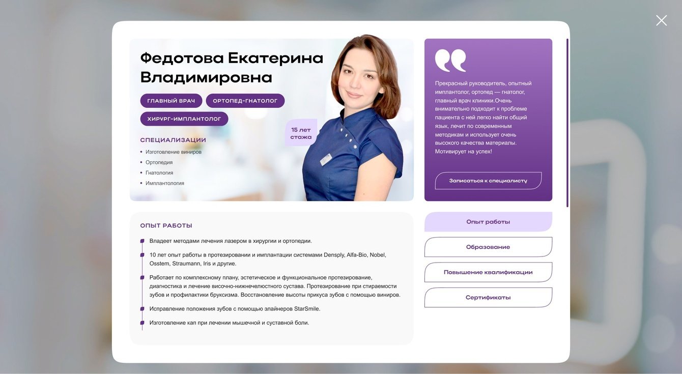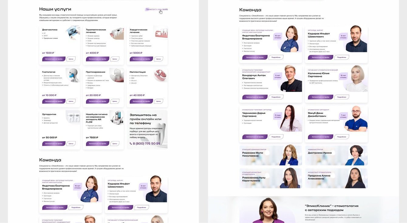• В блоке «Команда» расположены карточки врачей и сотрудников с подробной информацией об их опыте.
