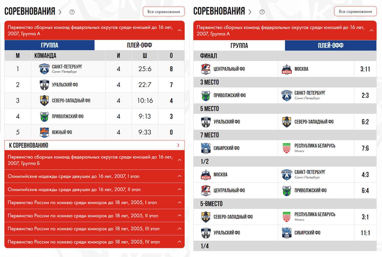 Проведена трудоемкая работа, чтобы обеспечить корректное выведение данных по турниру, матчам, составам команд, а также качественное отображение сводных таблиц. Выполнена настройка частичного и частого обновления данных. Благодаря этому турниры можно смотреть в режиме реального времени (онлайн).