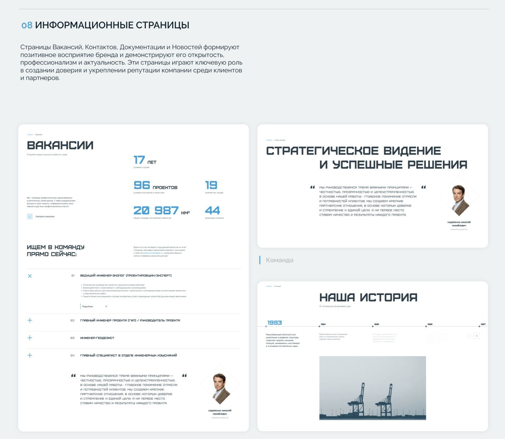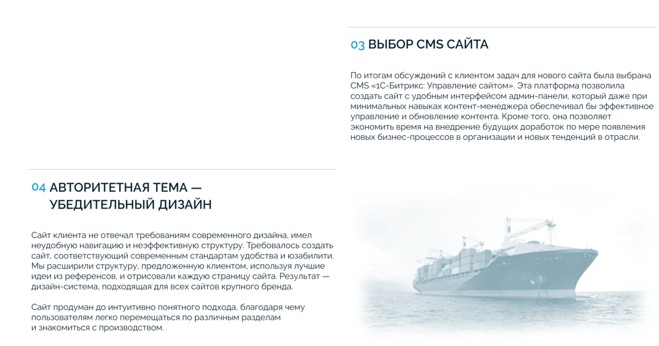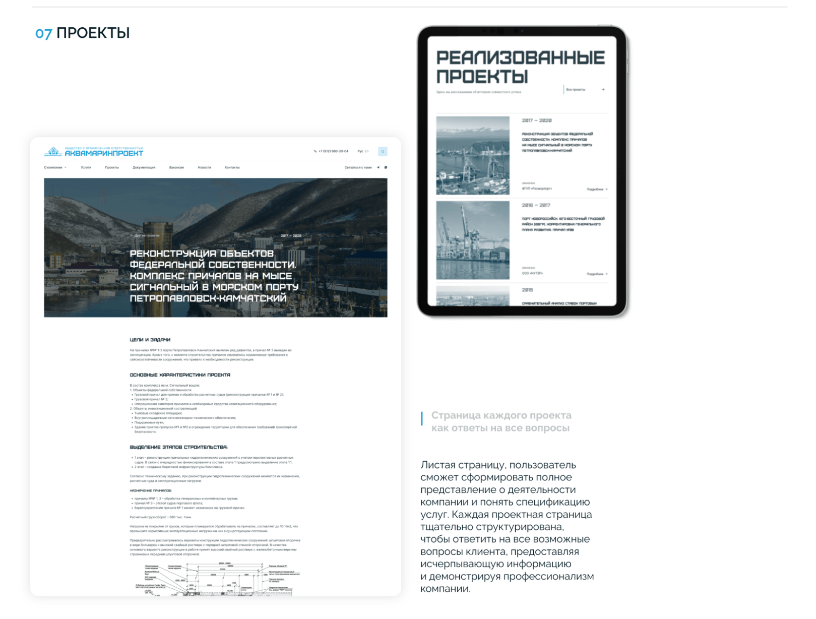 Листая страницу, пользователь сможет сформировать полное представление о деятельности компании и понять спецификацию услуг. Каждая проектная страница тщательно структурирована, чтобы ответить на все возможные вопросы клиента, предоставляя исчерпывающую информацию и демонстрируя профессионализм компании.